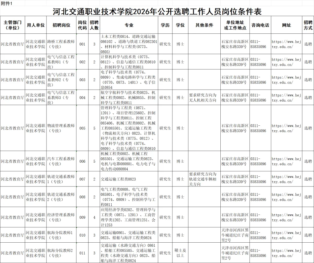 具体要求详见《河北交通职业技术学院2026年公开选聘工作人员岗位条件表》(附件1)。