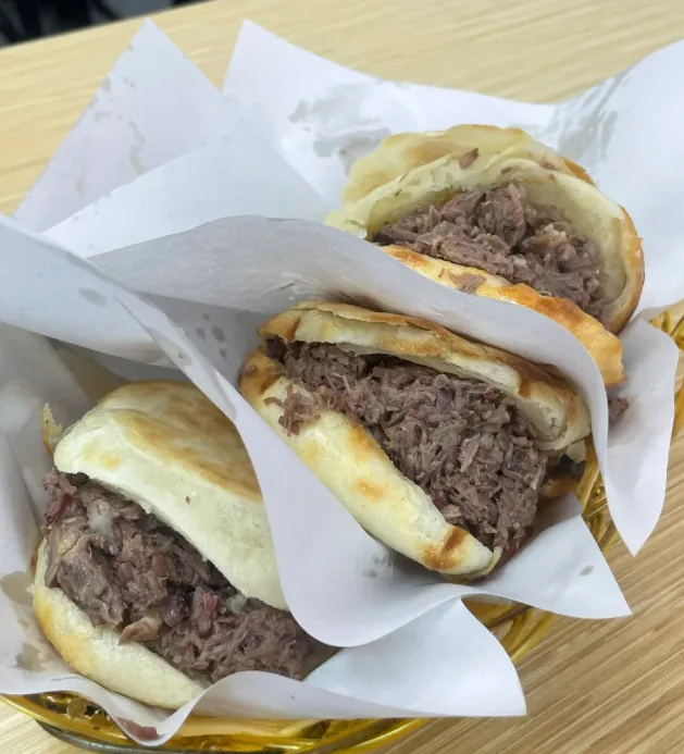 要说一款最适合外地人试试的,我会选咸驴肉火烧。做法不复杂,先把驴肉用老汤、花椒、八角和盐慢卤,卤到筋膜发软、肉香进芯,再把刚出炉的火烧横着切开,塞满切碎的驴肉和青椒。热气一裹,香就出来了,越嚼越稳。