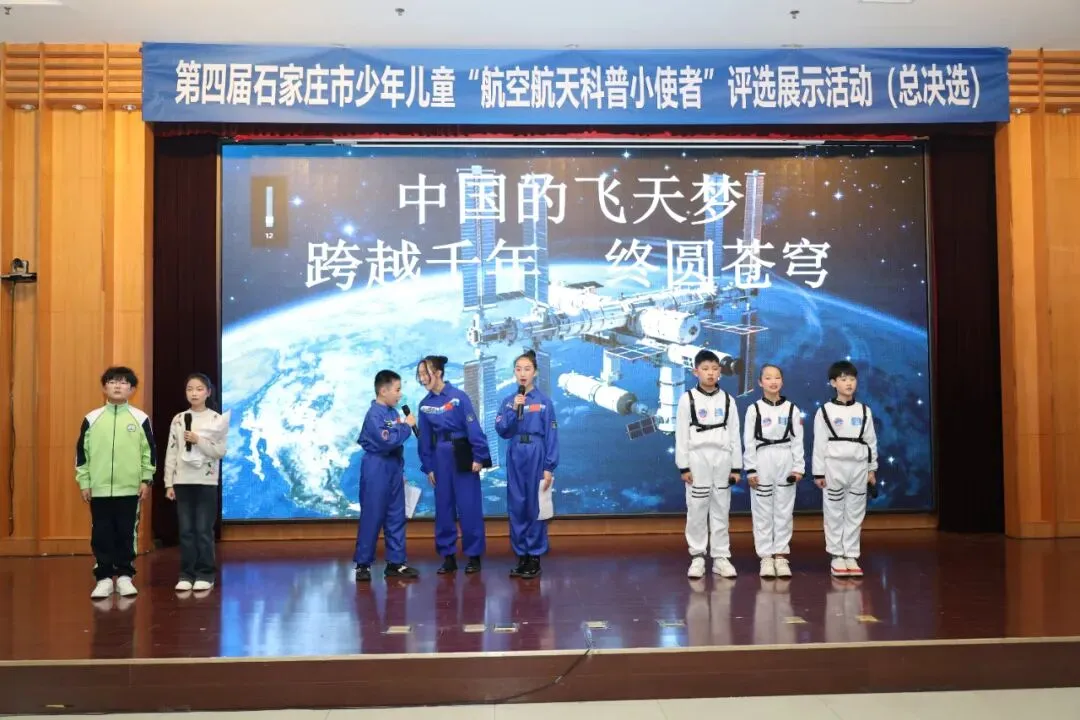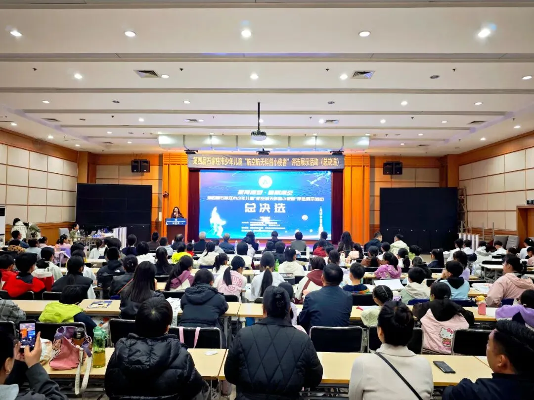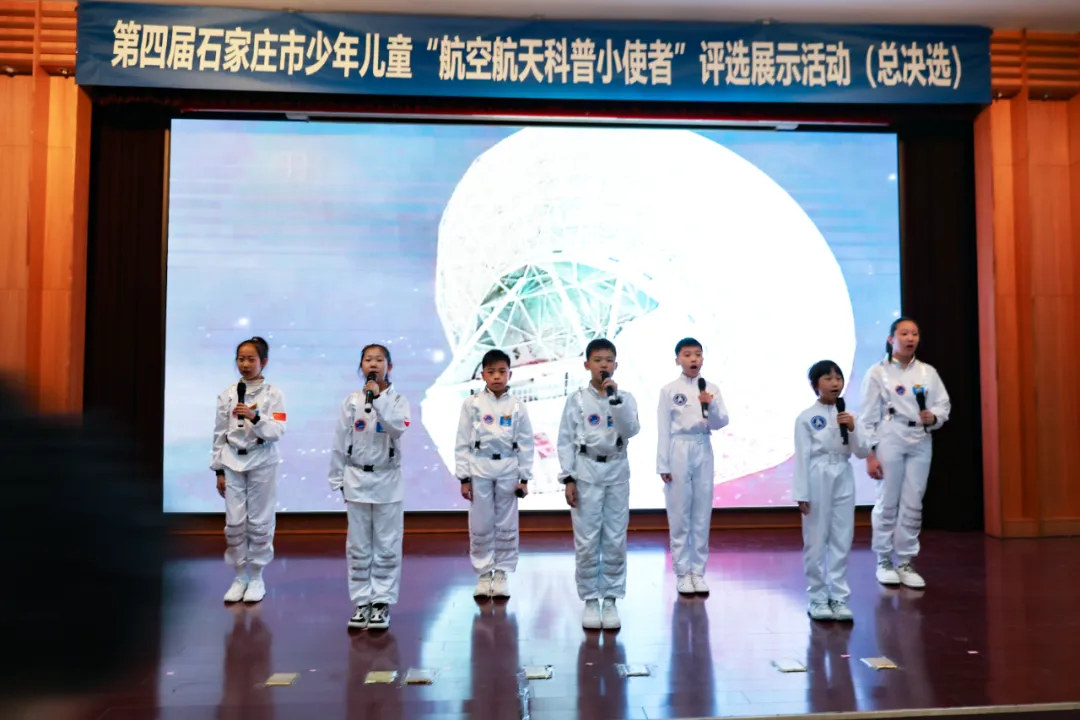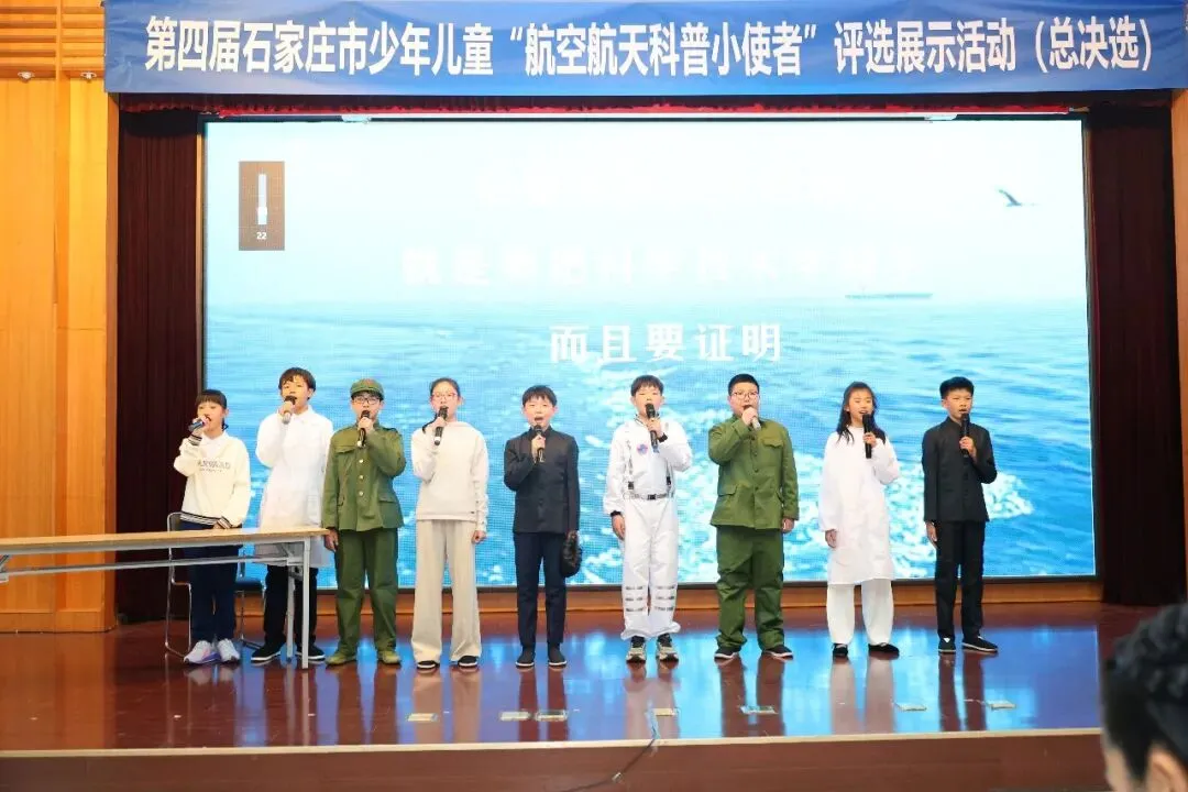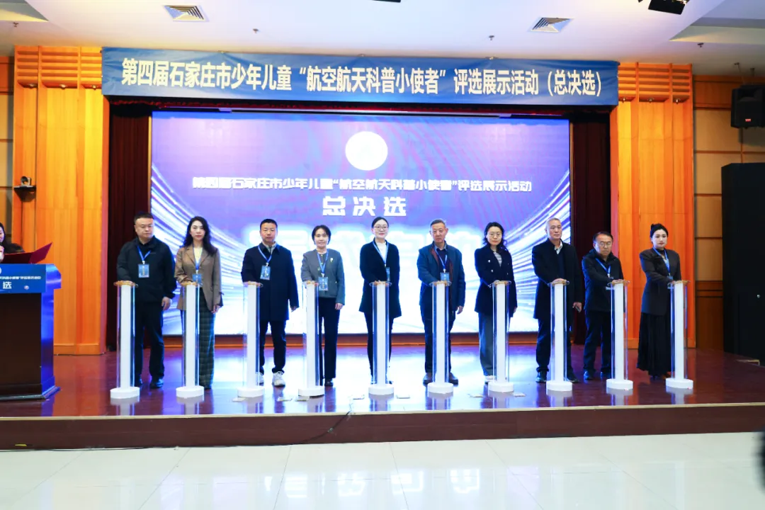 接下来,在热烈的掌声中,与会嘉宾共同上台,按下启动按钮,宣告第四届石家庄市“航空航天科普小使者”评选展示活动总决选正式启动。