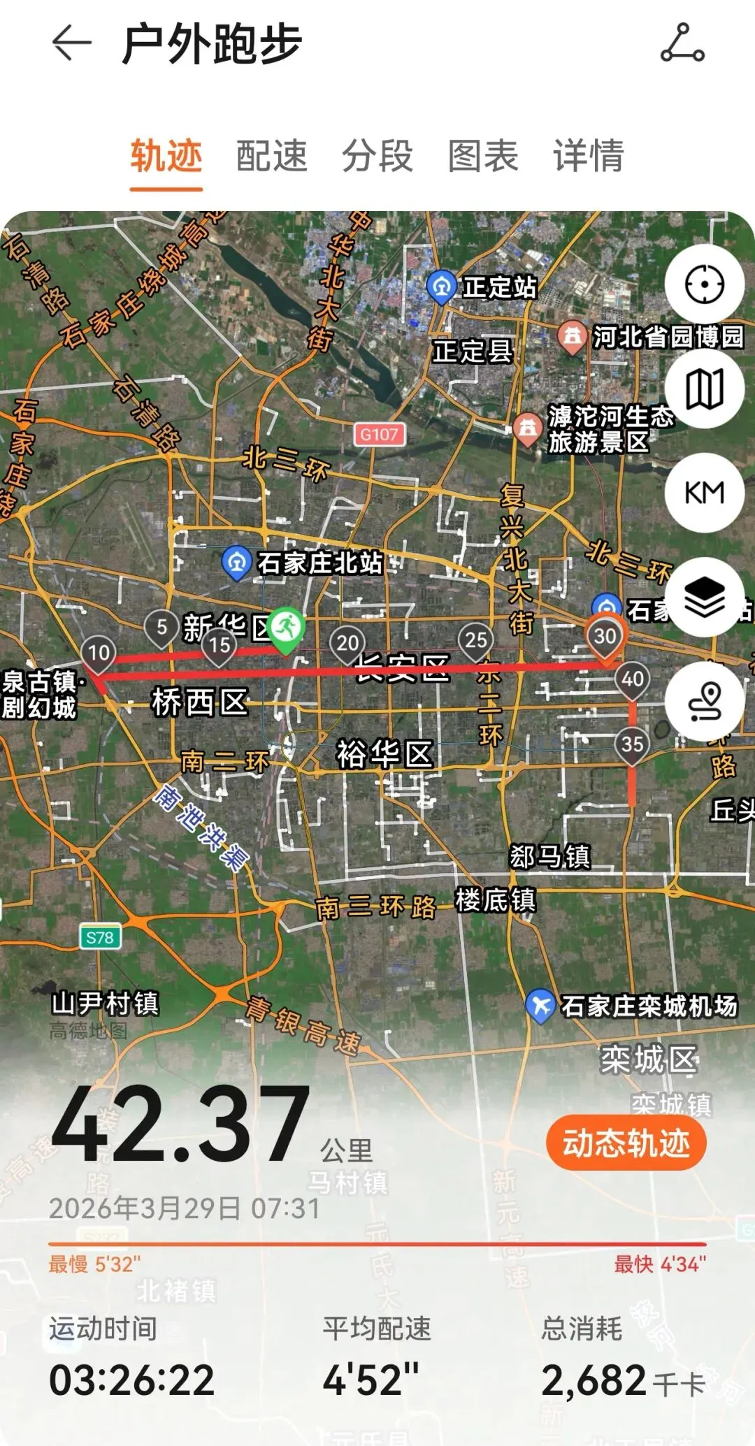 正定四塔分别是天宁寺凌霄塔、开元寺须弥塔、临济寺澄灵塔和广惠寺华塔。它们始建于隋唐,风格各异,被誉为“古建艺术宝库”的精华。 荣国府是国内首座影视实景拍摄基地,专为1987版《红楼梦》兴建 。分东、中、西三路五进四合院;中路为贾政公务区(荣禧堂为核心),东西两路为内宅院。 隆兴寺(俗称大佛寺),中国十大名寺,梁思成称其为京外名刹之首 。始建于隋开皇六年(586年),初名龙藏寺,唐改龙兴寺,清康熙四十九年(1710年)御赐“隆兴寺”匾额并沿用至今。集建筑、造像、碑刻、壁画于一体,是我国现存规模宏大、保存完整的宋代佛教建筑群。遗憾的是大悲阁正在修缮中。 29日,一夜春雨,浮尘尽消,石家庄迎来清新的早晨。 石家庄马拉松的口碑不错,被众多跑友称为“最容易创PB(个人最好成绩)的赛道”之一。从解放广场出发,跑过正太广场、河北博物院、火炬广场等地标,远眺复兴大街滹沱河大桥,感触石家庄的“绿色和青春”。赛道主要设在中山路、裕华路等主干道,宽、平、直,折返少、起伏低,全程爬升不大且多为缓坡,可谓“一马平川”。 考虑平直PB赛道,起跑按完赛成绩3:15配速。上周无锡马拉松出现心率偏高,石家庄马拉松边跑边观察心率变化情况。半马用时1:37:52,随后身体疲惫,状态下滑,配速调整为455~459,30Km后持续掉速至515~520。崩盘的过程与上周的无锡马拉松如出一辙,幸运的是全程心率在比赛的正常范围,证明无锡马拉松高心率属手表飘了。