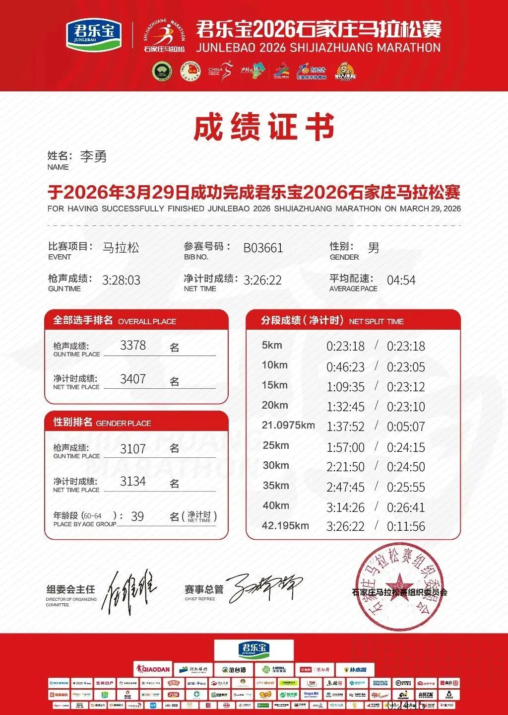 完赛成绩3:26:22,手表显示累计爬升58.2米。百马历程第四十八场顺利完成。 2026石家庄马拉松奖牌整体造型为圆形设计,“2026石家庄马拉松”的英文字母环绕成圆。奖牌中间为石家庄的标志性建筑:冀之光灯塔,寓意新的希望;复兴大街滹沱河大桥飞跨碧水,勾勒城市轴线;河北艺术中心舒展身姿,展现文化底色;解放纪念碑庄严矗立,铭刻红色记忆。浮雕层叠之间,是城市发展的缩影。中央设置可旋转结构,象征选手以脚步丈量过的距离,自我突破的轨迹。