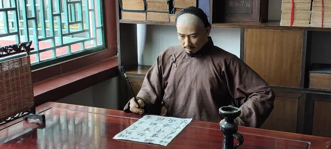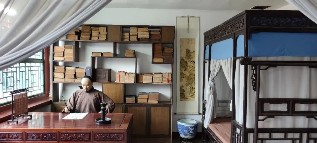 旁边是曹雪芹的卧室,有床书桌和书架,有一个曹雪芹的像,面前有一幅字,是红楼梦开篇诗