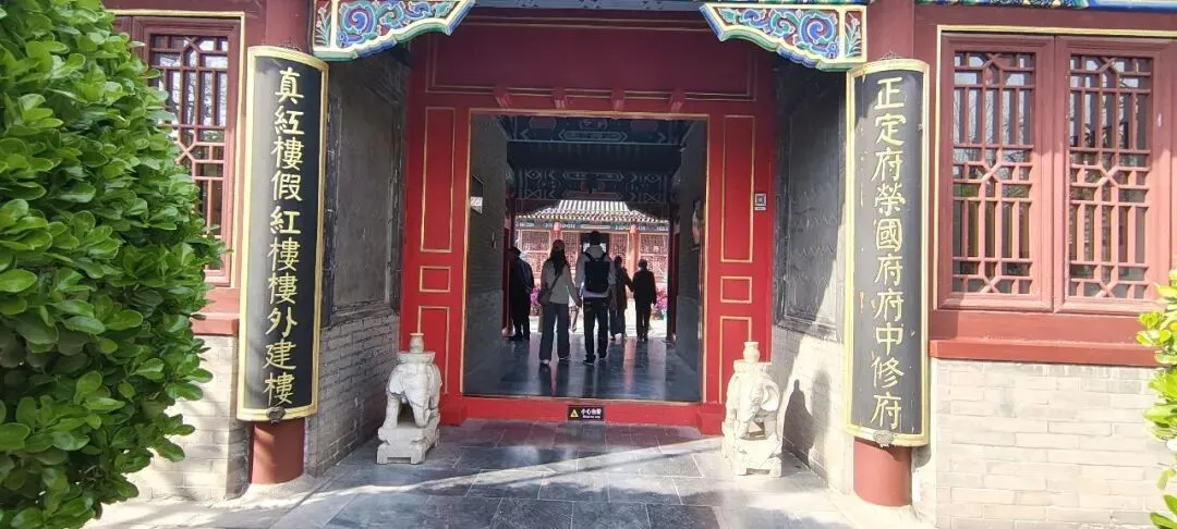 回到中间通道,门廊两侧的柱子上有一首对联“正定府荣国府府中修府,真红楼假红楼楼外建楼”对仗工整,结词巧妙,不知道出自哪位大师之手笔。
