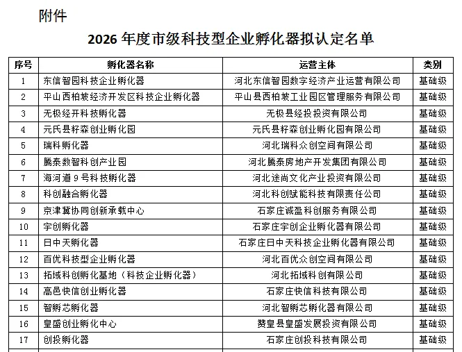 石家庄市科技局公示2026年度市级科技型企业孵化器拟认定名单