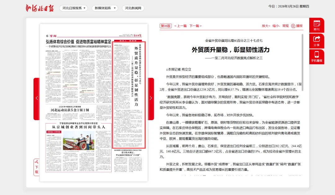 全省外贸总值同比增长百分之三十七点七 外贸质升量稳,彰显韧性活力——一至二月河北经济数据亮点解析之三