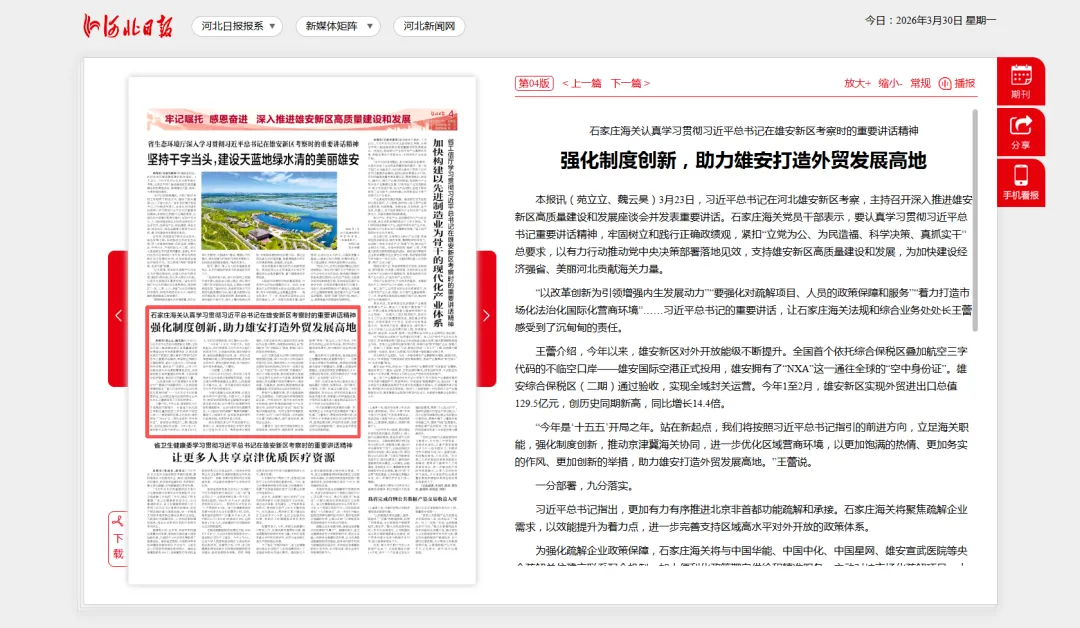 石家庄海关认真学习贯彻习近平总书记在雄安新区考察时的重要讲话精神 强化制度创新,助力雄安打造外贸发展高地