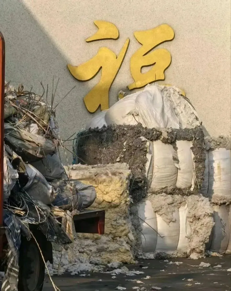 · 大量打包棉料露天堆放,地面散落棉絮碎屑,门口墙面附近亦堆有成包原料;