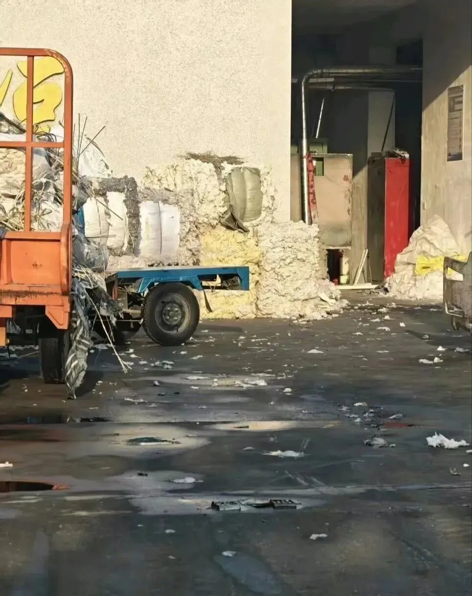 · 地面存在积水与油污痕迹,车辆进出时棉絮碎屑散落至周边街巷路面,未见明显除尘或固废收集设施;