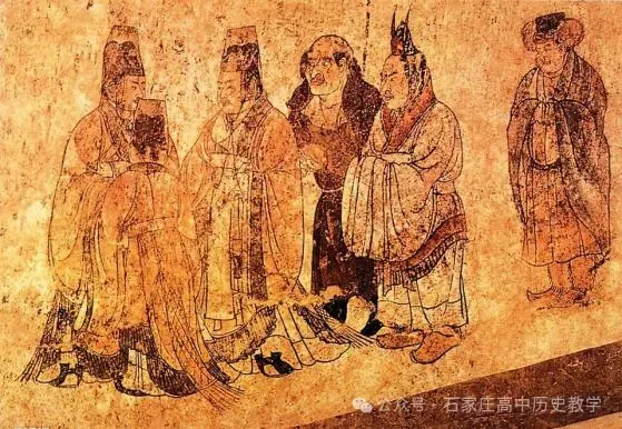 某AI工具:小明你好,该图为《礼宾图》,出土于陕西乾县乾陵章怀太子李贤墓墓道东壁,创作于神龙二年(706年),纵184厘米,横342厘米,现藏于陕西历史博物馆。该壁画以六人组合场景描绘了唐朝理藩院官员接待外国使节的场景,人物服饰与形象特征具有鲜明地域标识。