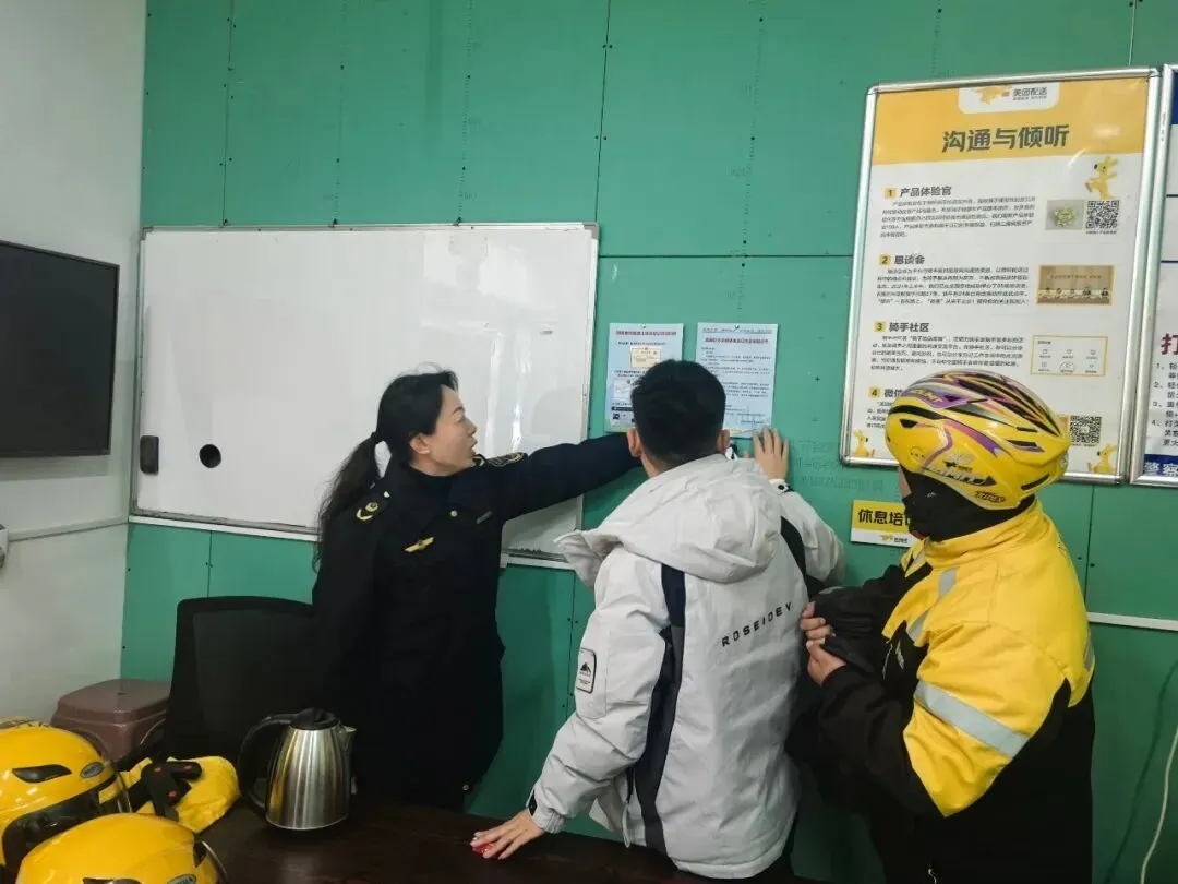 三是提高监督效能。积极开展培训指导,利用美团骑手海世界站、闽江站和饿了么(淘宝闪购)骑手水榭花都店的骑手例会,工作人员向80余名参会骑手进行宣传号召,讲解网络餐饮经营主体食品安全知识,并与站长、骑手代表进行座谈。设计制作并向外卖骑手发放了《网络餐饮经营主体合法证照明白纸》,以图文并茂的形式,指导外卖骑手了解网络餐饮经营主体需持有的营业执照、许可证、人员健康证等资质的形式、内容,以及证照登记地址必须与实际经营地址相符等重点监督事项,确保外卖骑手了解相关知识,及时发现并反馈问题线索,助力网络餐饮食品安全问题整治。