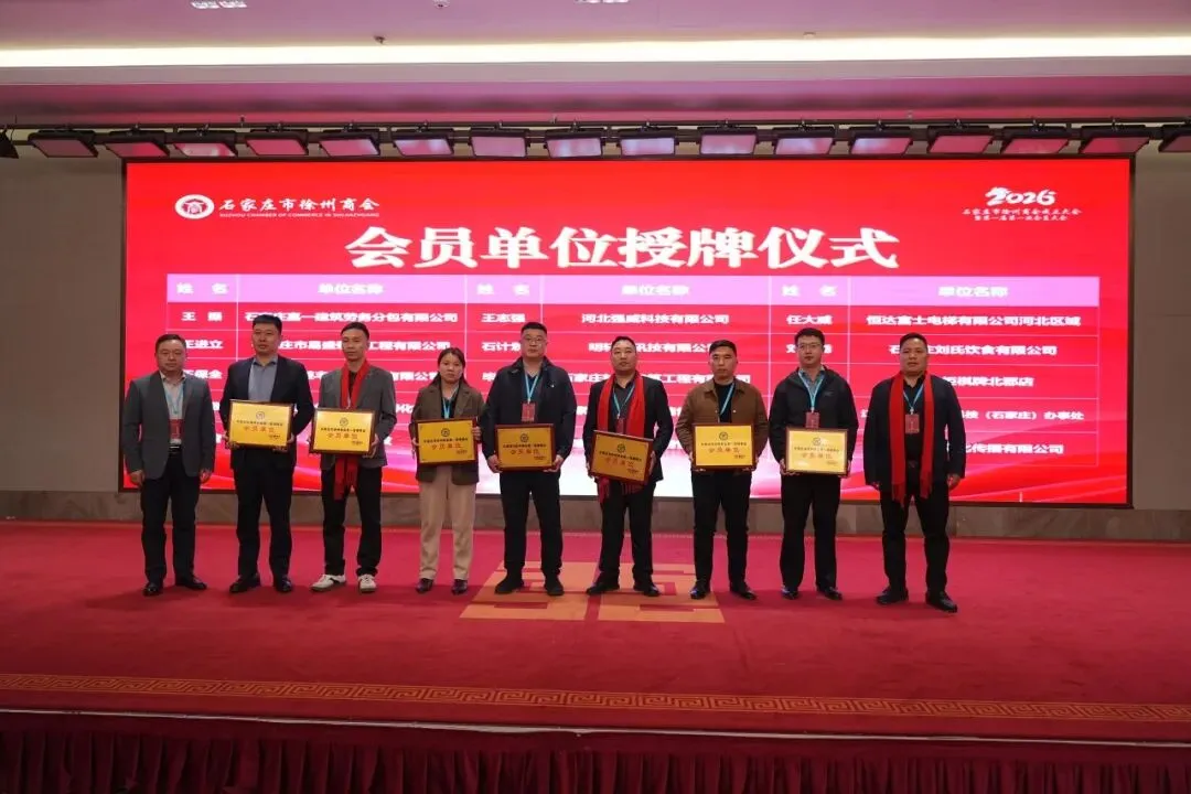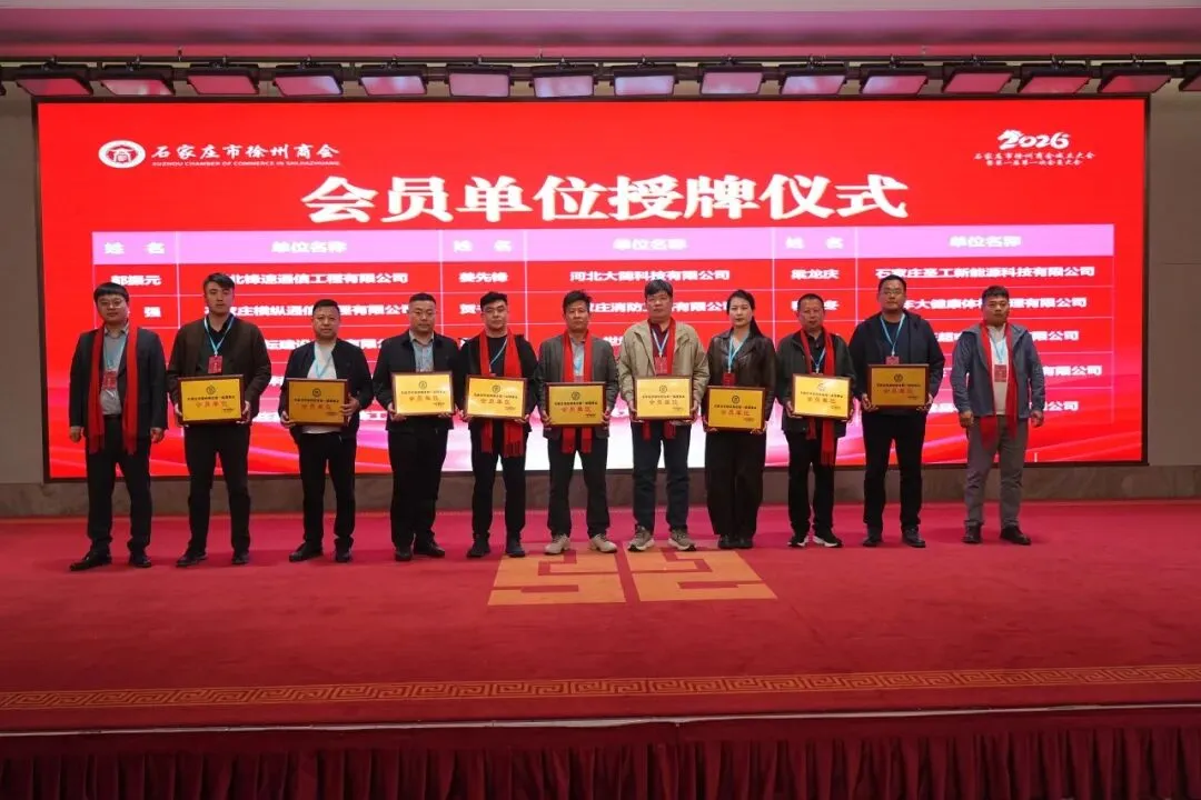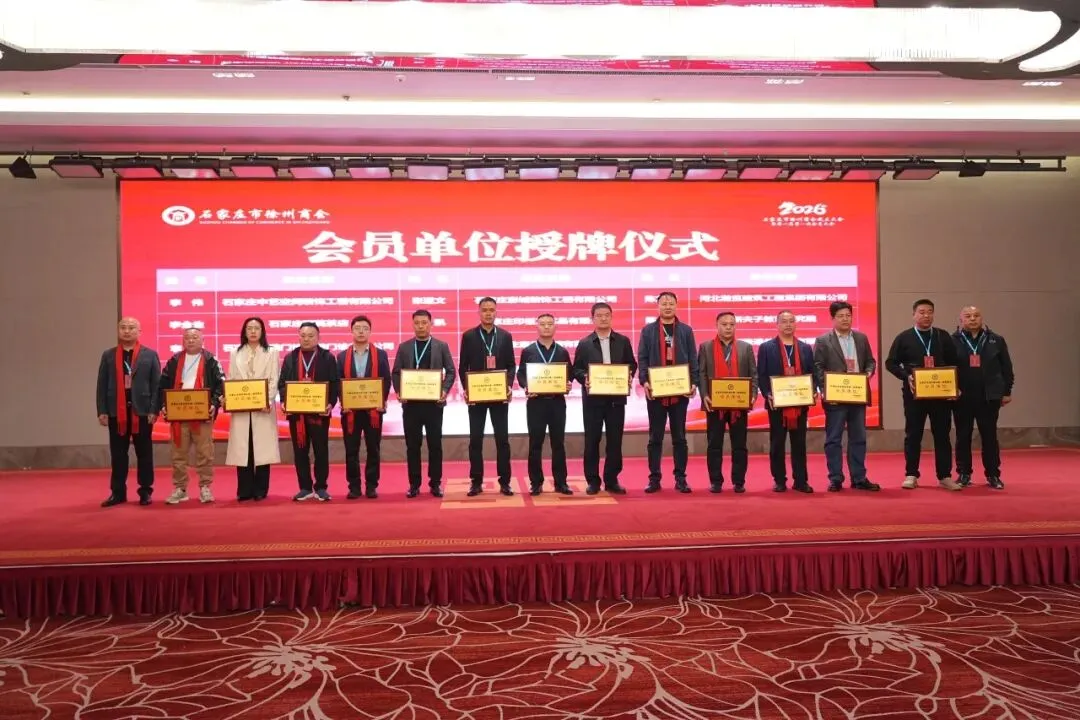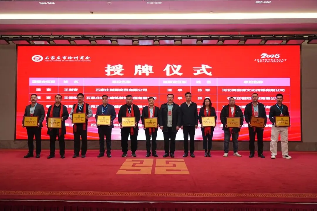揭牌与授牌仪式将大会气氛推向高潮。石家庄市委统战部副部长、市工商联党组书记李会强与徐州市委统战部副部长、市工商联党组书记秦玉锦共同为石家庄市徐州商会揭牌,红纱落定,“石家庄市徐州商会”牌匾熠熠生辉,象征着商会正式启航,也为在石徐州籍企业家搭建起专属的发展平台。