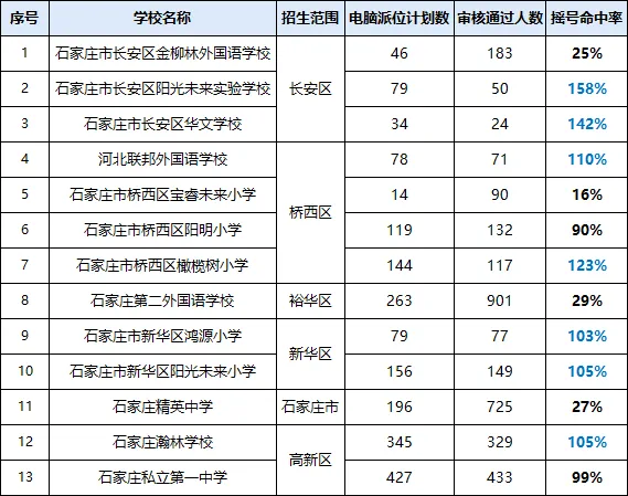 摇号命中率说明:命中率超过100%则代表报名人数少于招生计划数,审核通过即“成功上岸”。