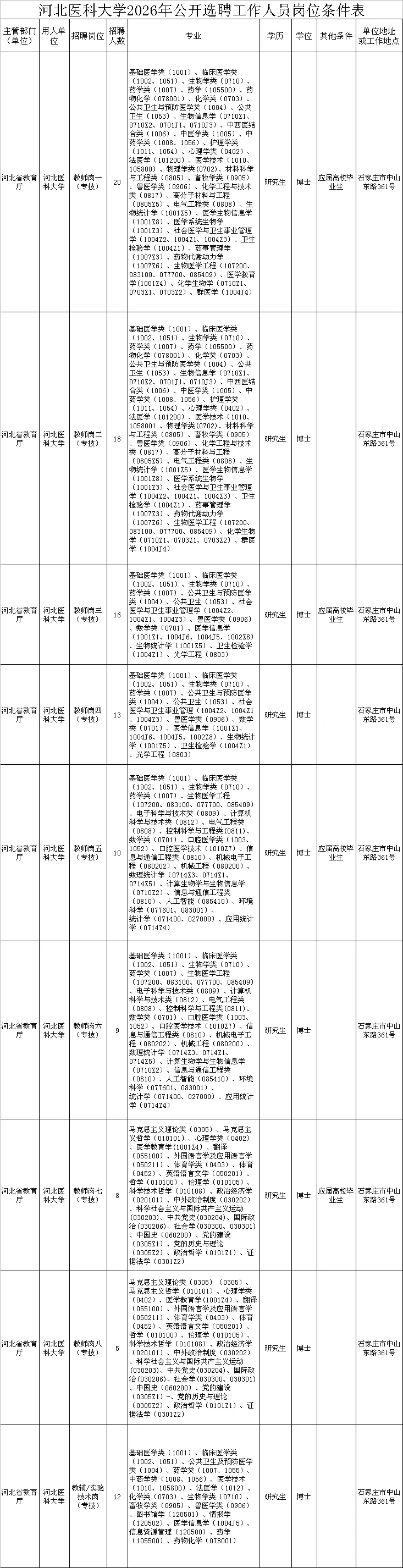 具体要求详见《河北医科大学2026年公开选聘工作人员岗位条件表》(附件1)。其中专业参考教育部《授予博士、硕士学位和培养研究生的学科、专业目录》《普通高等学校本科专业目录》设置。