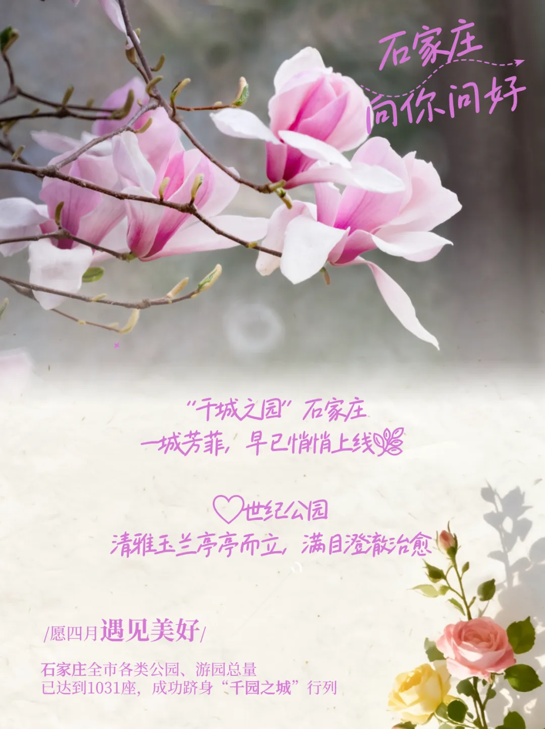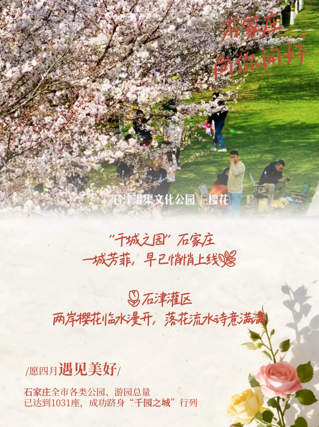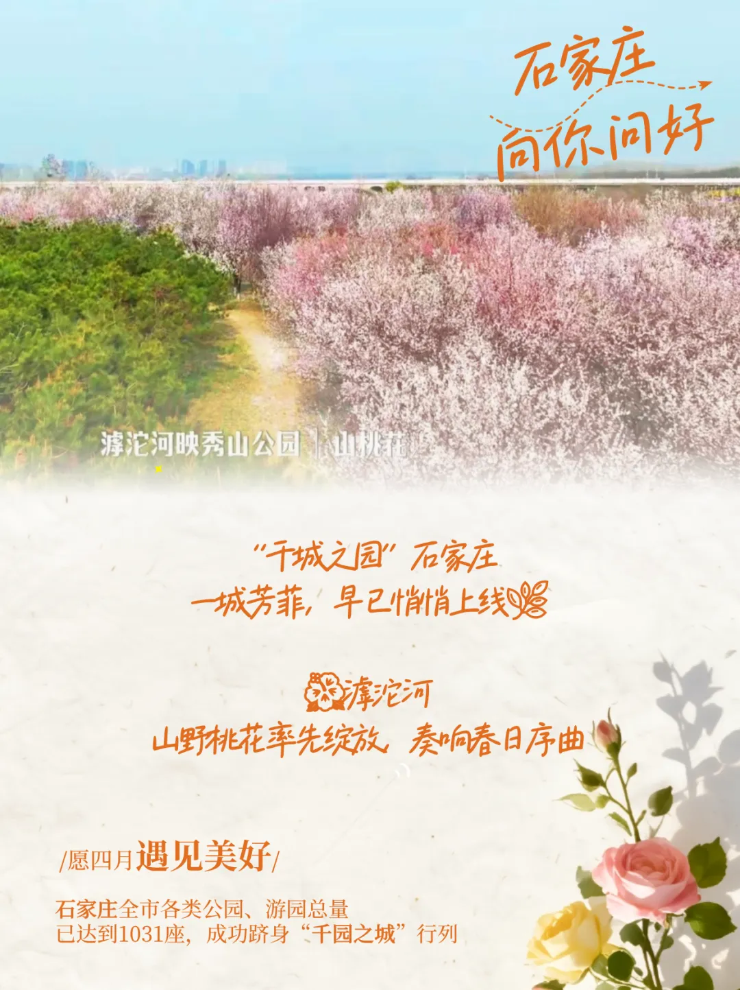 春风拂面,一城芳菲早已悄悄上线。截至目前,石家庄全市各类公园,游园总量已达到1031座,成功跻身"千园之城"行列,从河畔到街角,步步皆花海,京津冀周末短途出游,就来石家庄赴一场春日之约,趁着风和日暖,邂逅满眼浪漫吧~