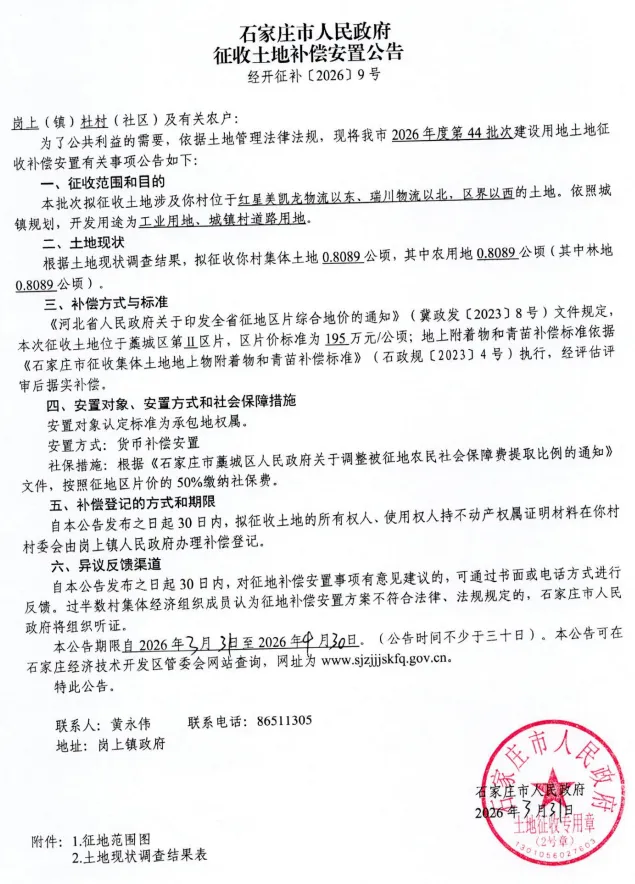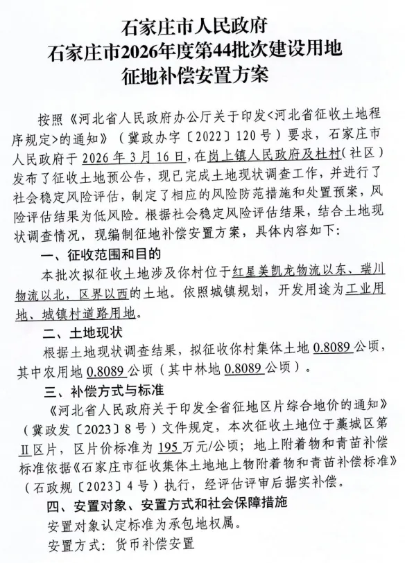 >石家庄市人民政府征收土地补偿安置公告 经开征补[2026]9号;安置方案