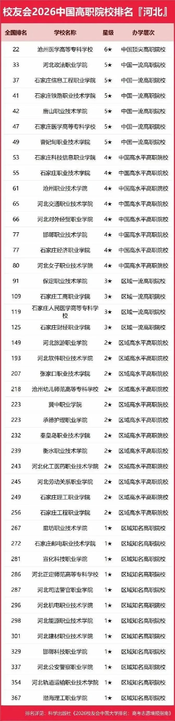 关注排名前几位的院校可以发现河北高职教育的领军学校。沧州医学高等专科学校位列第22名,是国家级高职教育院校。这是河北高职教育的标志性的成果,很好地体现了该院校在培养医疗专业人才方面的能力。河北政法职业学院在所有院校中位列第33名,是国家优质高职院校办学层次的院校之一,也是五星院校。石家庄信息工程职业学院、石家庄铁路职业技术学院也属于五星级行列之中,从侧面说明了石家庄是河北省的教育中心。