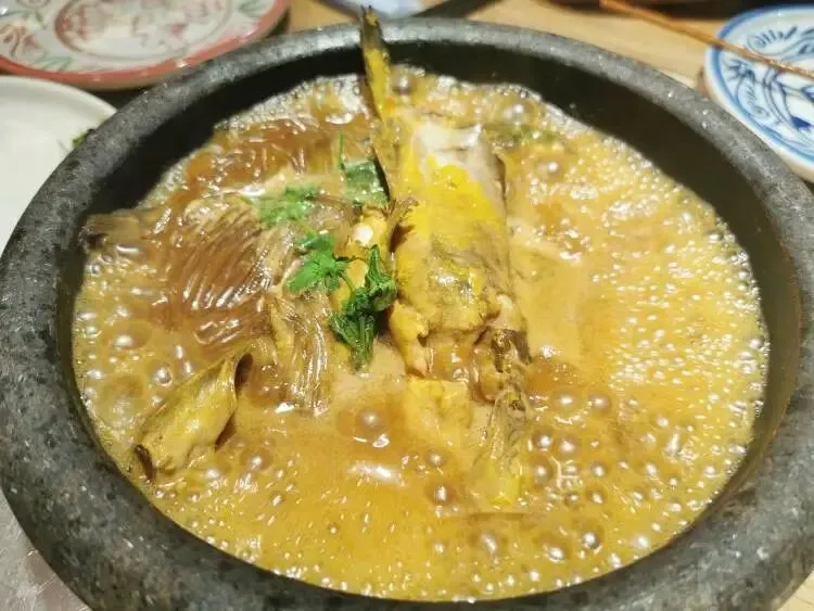 再来尝尝白洋淀石锅嘎鱼,整锅鲜味儿爆棚。嘎鱼刺少肉嫩,石锅保温锁鲜,汤汁醇厚浓郁,鱼肉吸满酱汁,拌饭直接封神。