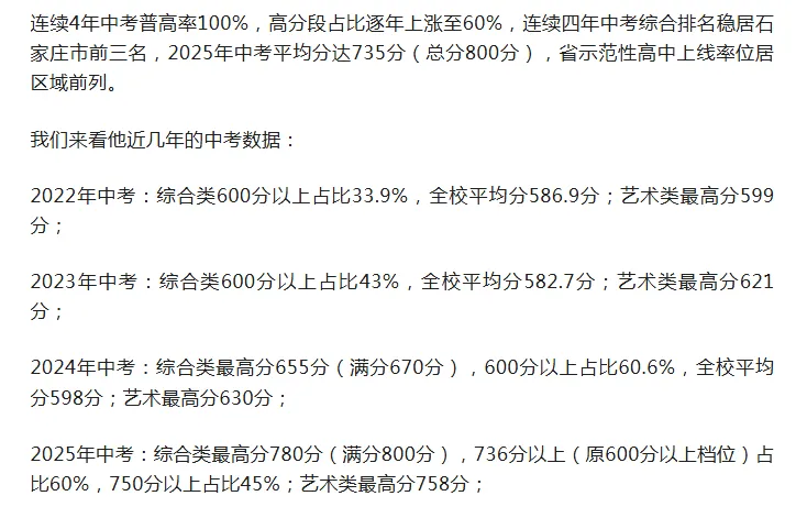 校方高调宣称:连续4年中考普高率100%,高分段占比逐年上涨至60%,中考综合排名稳居石家庄市前三名,2025年中考平均分达735分(总分800分),省示范性高中上线率位居区域前列。2025第一年高考,多人考入985/211重点大学…貌似一看,瀚林好像很牛叉,中高考成绩超过一众老牌名校。可是这些成绩的真伪无法验证,官方也严禁炒作宣传中高考升学率、名校率等。