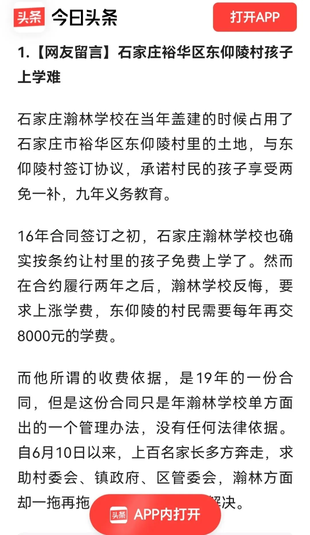 此外,石家庄瀚林学校曾与东仰陵村有学费违约纠纷,在合约履行两年之后反悔,要求上涨学费,东仰陵的村民需要每年再交8000的学费,引发村民的不满和投诉。