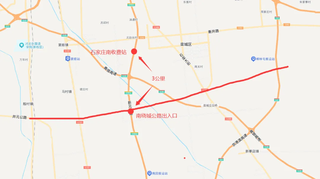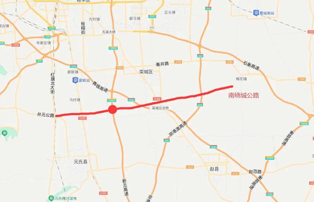 石家庄2026年的一项重大道路工程,估计就是南绕城公路的建设。南绕城公路将会依托衡井线南移,作为石家庄南部的一条绕城公路。衡井线已经被升级为国道618了,衡井线将会南移到栾城城区南部,西边和井元公路衔接。按照规划,这一段国道会建设为双向两车道。两车道有点窄啊,至少应该双向四车道,比较合适。衡井线栾城段,已经成为市区道路,也已经禁止大货车通行了。南移后,大大缓解了衡井线上的大货车通行。这条南绕城公路,将会和三条高速交叉,京港澳高速,青银高速,新元高速,而与新元高速将会规划一处出入口。按照目前规划,南绕城经过栾城西营乡北侧,因此出入口也会位于这里。在这里设置出入口,基本主要就是方便石家庄南部人民往返市区的。因为新元高速市区段已经是复兴大街了,所以过境货车提前就转京港澳高速,或者新元高速转青银高速了。像赵县南部以及元氏南部的人们,可以从308国道,或者107国道,转到南绕城,然后进入新元高速,再进入市区,时间大大缩短。大家看下地图,新元高速的南绕城出入口,到石家庄南收费站,仅有6公里左右,如果按照每公里5毛钱,这一段仅有3元高速费。这其实和新乐差不多,走新元高速,从石家庄至正定机场有政府补贴,继续免费。但是正定机场收费站至新乐收费站,在12公里左右,新乐走这一段还是收费的,大概5元吧,但是从正定机场收费站进入市区,就是免费了。所以新乐车辆可以到正定机场收费站上新元高速,进去市区。南绕城修好后,从新元高速进入市区,估计也得有2至3元的高速费。其实大家算下,石家庄市区至正定机场,大概有25公里左右,近几年一直给车辆补贴高速费。而市区往南25公里左右,正好就到元氏城区了。要是这一段也能补贴高速费就好了。使得元氏到市区,也能实现免费。