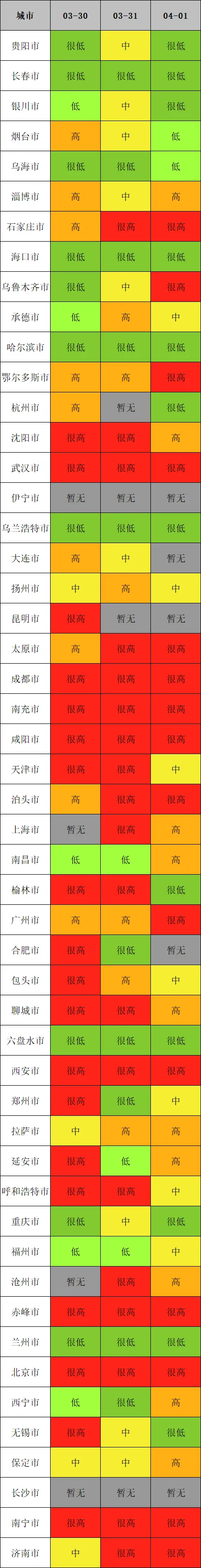 日期:4月1日高风险城市:📍北京、石家庄、乌鲁木齐、鄂尔多斯、武汉、太原、成都、南充、咸阳、泊头、广州、西安、呼和浩特、沧州、赤峰、南宁、济南