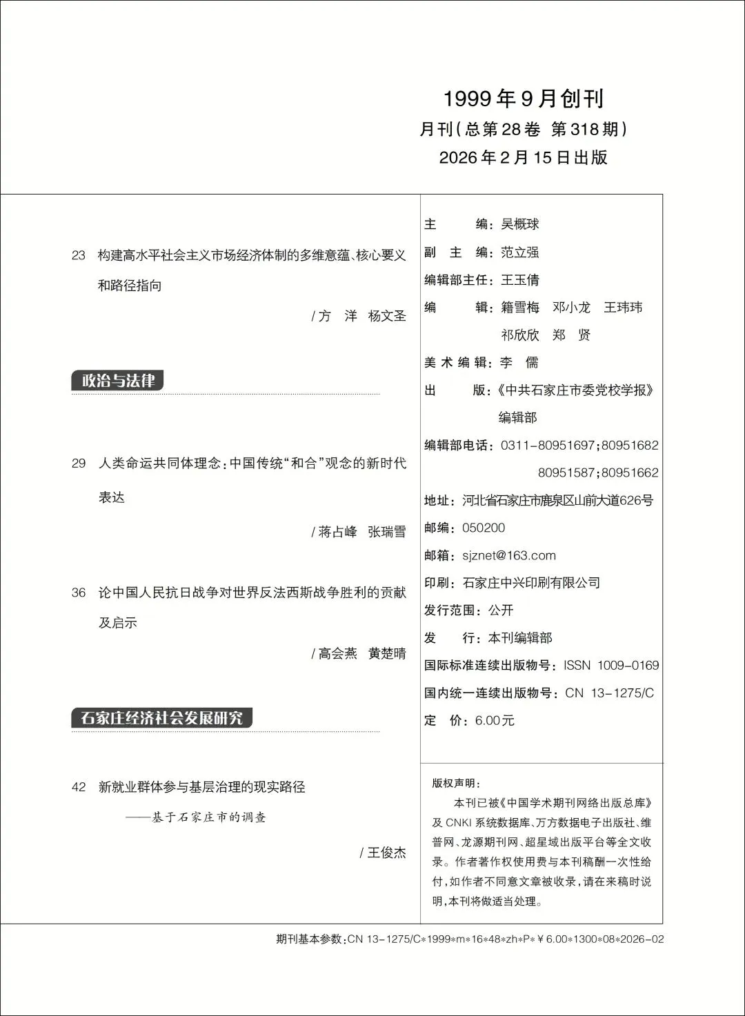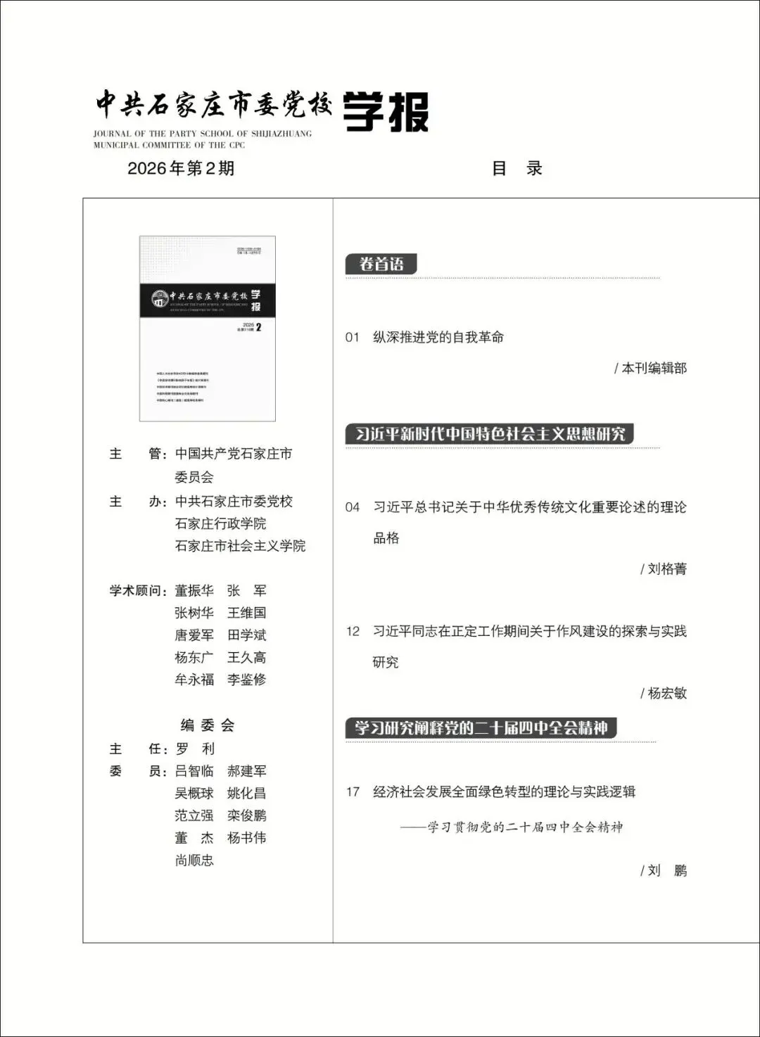 >《中共石家庄市委党校学报》2026年(28卷)第2期目录