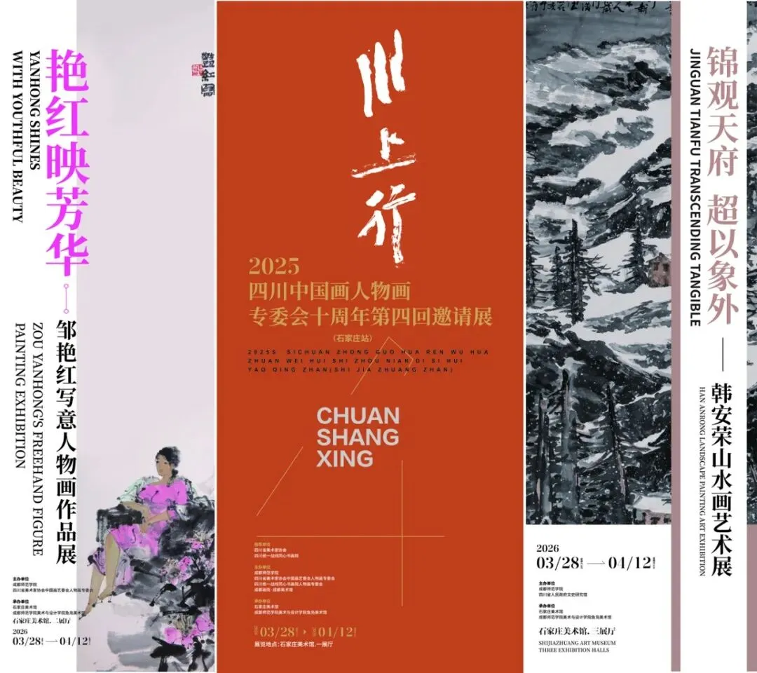 春风送暖,艺苑飘香。2026年3月28日,三场各具特色的美术展览在石家庄市美术馆启幕,为春日里的城市增添浓郁的人文气息与艺术魅力。本次联展由四川省美术家协会、四川统一战线同心书画院等单位指导,成都师范学院、四川省美术家协会中国画艺委会人物画专委会、四川省人民政府文史研究馆、四川统一战线同心书画院人物画专委会、成都画院·成都美术馆主办,石家庄市美术馆、成都师范学院美术与设计学院鱼凫美术馆承办。三场展览集中呈现了四川中国画人物画专委会十年来的创作成果,以及邹艳红、韩安荣两位艺术家的近年力作,为观众带来一场跨越地域、风格多样的艺术盛宴。