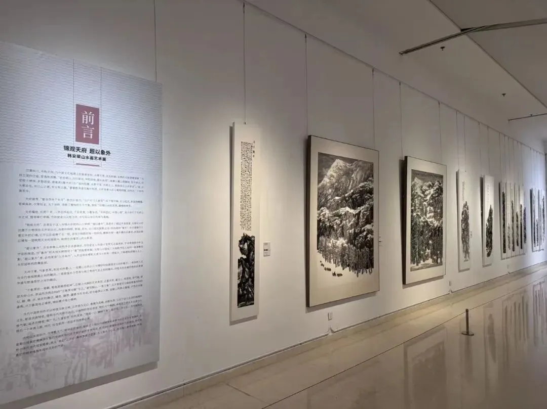 “锦观天府 超以象外——韩安荣山水画艺术展”则将观众带入一片苍茫幽邃的山水世界。韩安荣,原成都师范学院美术与设计学院学术院长、四川省人民政府文史研究馆馆员,其画作深研传统,又自出机杼。他以巴山蜀水为创作根基,总结出“万象浑沦皴”技法,以苍润的笔墨、奇崛的构图表现川西高原的雄秀之气与川南丘陵的氤氲之美。展览主题“超以象外”出自唐代司空图《二十四诗品》,意在强调作品超越物象本身,追求精神境界与意境深远的艺术取向。观其画作,笔墨沉厚而不失空灵,气象宏大而蕴含精微,山川、云霭、村舍在虚实相生间构成可观、可居、可游的诗意空间。