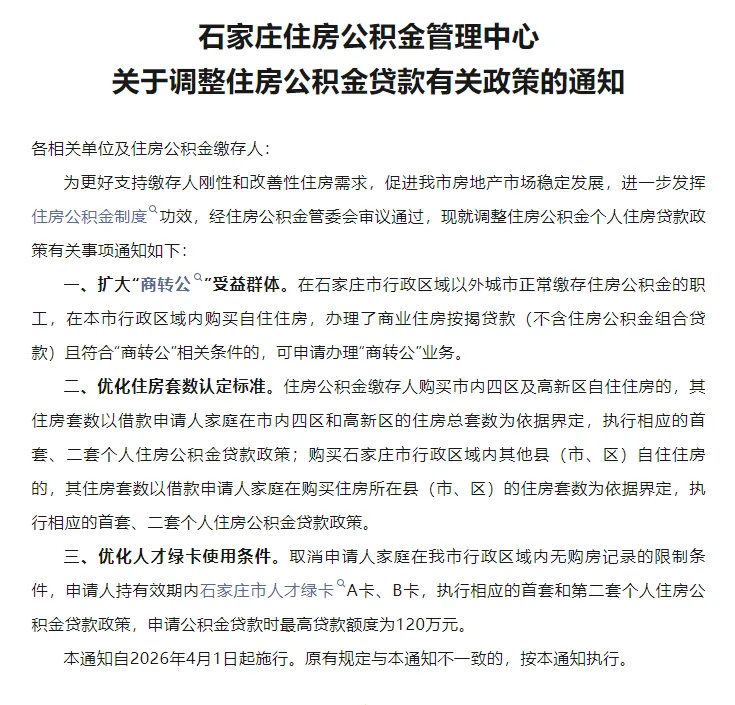 2026年4月1日起石家庄市住房公积金政策有了新的调整,原有规定与本通知不一致的,按本通知执行。