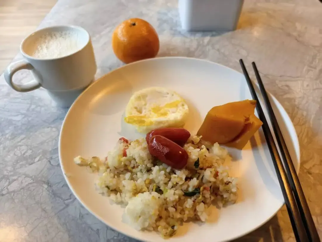 因为去得比较晚了,过了九点才去,一些吃食已经没有了。一个女住客问店员肉包子还会不会上。我就不管那么多了,有什么吃什么。我记得拿了炒饭、南瓜、香肠、煎蛋、牛奶、橙子,坐定后看见现做的柜台那里有新鲜的牛肉板面,标榜石家庄特产。不过我没好意思上去管人家要。吃完了之后,回到房间看看河北省博物院的参观情况,提前先约上,就退房出门了。