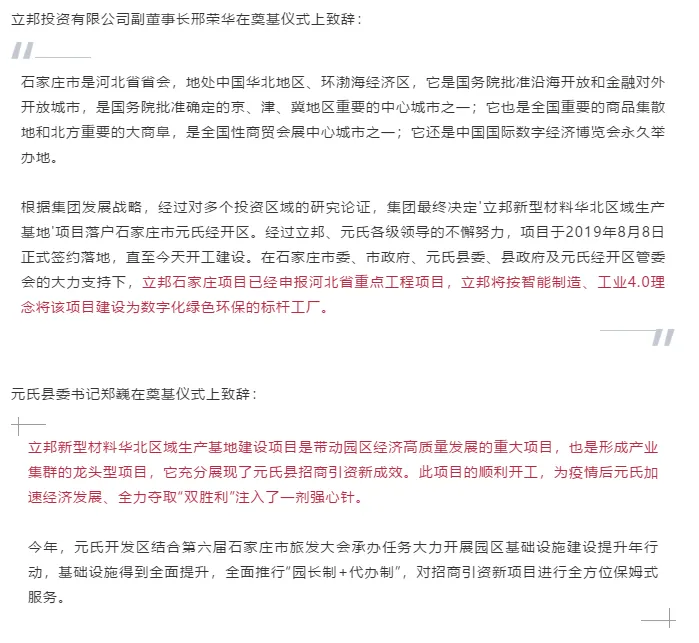 随着河北省石家庄市市长李雪荣一声令下,石家庄市元氏经济开发区内机器轰鸣,立邦新型材料华北区域生产基地建设项目按下了启动键。