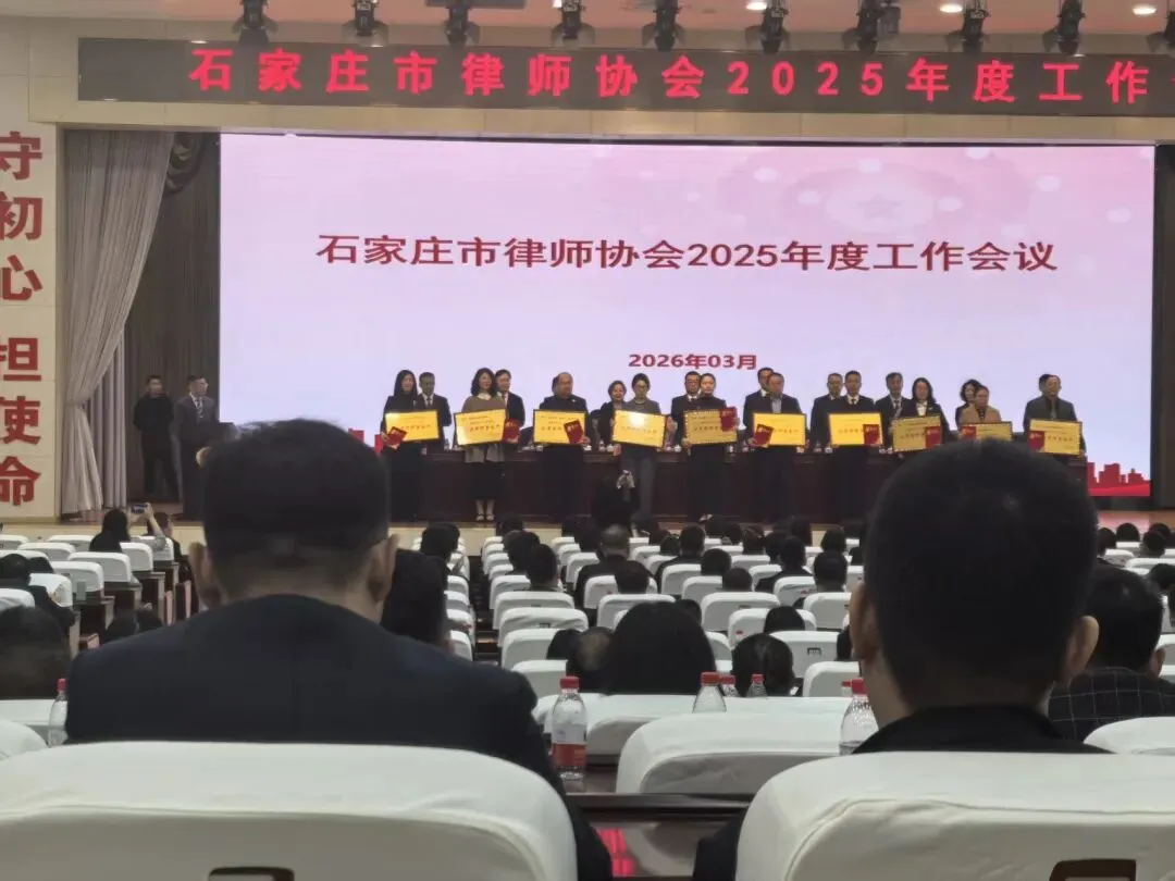 2026年3月28日,石家庄市律师协会2025年度工作会议在国家检察官学院河北分院召开。市律师协会领导班子以及全市律师事务所主任、执业满30周年律师代表、受表彰律师代表、新执业律师共计600余人参加会议。公布了《关于表彰2025年度优秀律师事务所、优秀律师及先进单位、先进个人的决定》。