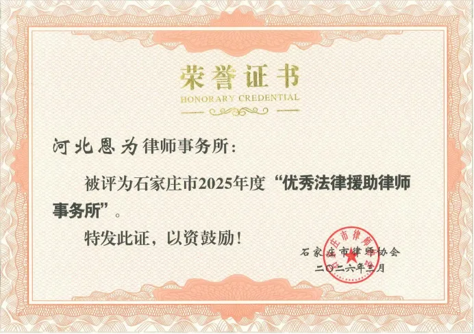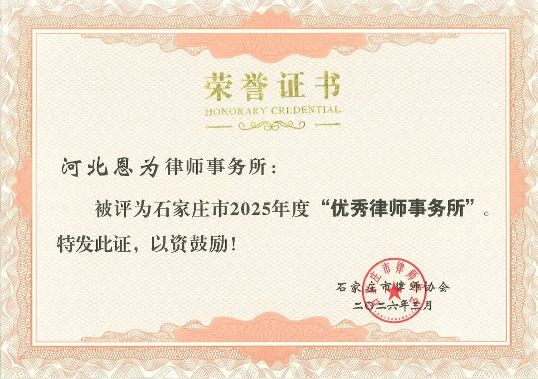 河北恩为律师事务所被评为石家庄市2025年度“优秀法律援助律师事务所”、“优秀律师事务所”个人奖项方面,李东海主任获得年度优秀律师;张云霞律师获得优秀公益律师;李建红律师获得优秀法律援助律师、优秀公益律师;李娜律师获得年度优秀工作者、优秀律师;尹国赞律师获得年度优秀律师;任唯东律师律师执业30周年纪念奖牌。殊荣加身,倍感荣光;使命在肩,步履不停。这些荣誉,不仅是过往耕耘的累累硕果,更是未来前行的不竭动力。从集体荣誉到个人嘉奖,每一份认可都凝聚着全所律师的同心协力、砥砺深耕,承载着客户的信任托付,更彰显着法律人践行法治、服务社会的坚定担当。