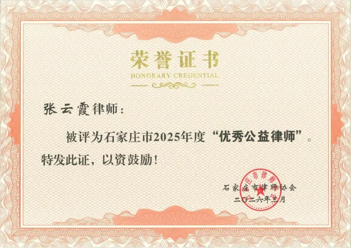 张云霞律师被评选为石家庄市2025年度“优秀公益律师”