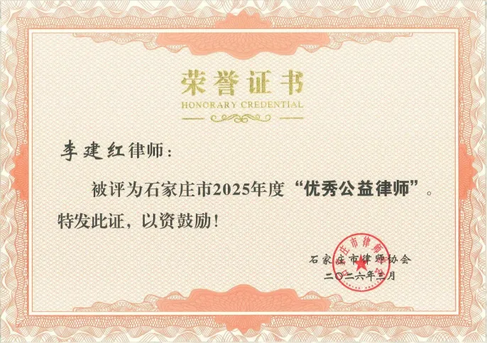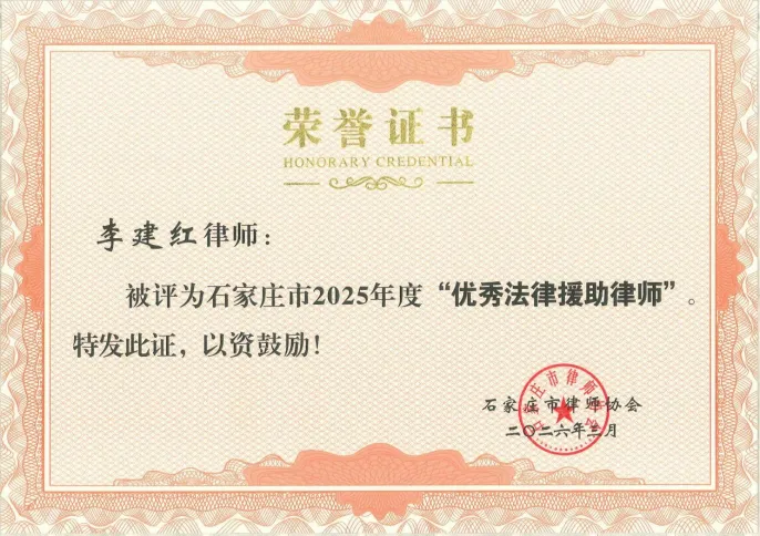 李建红律师被评选为石家庄市2025年度“优秀法律援助律师”、“优秀公益律师”
