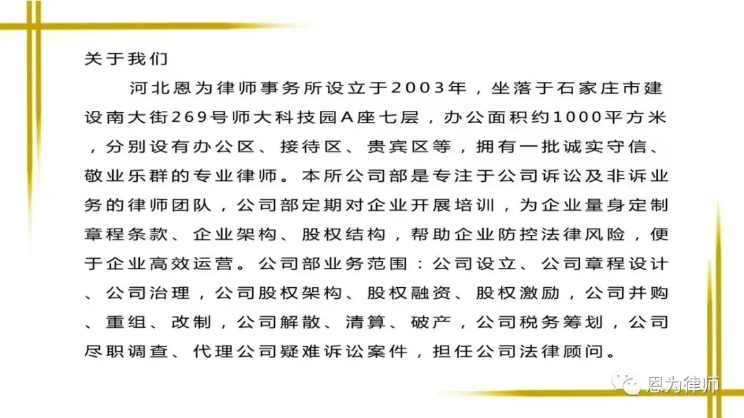 二十余载稳健耕耘,恩为律所始终以党建引领、专业立身、诚信致远为立所之本,坚守法治信仰、守护客户权益,在燕赵大地树立专业、可靠、有担当的律所标杆。