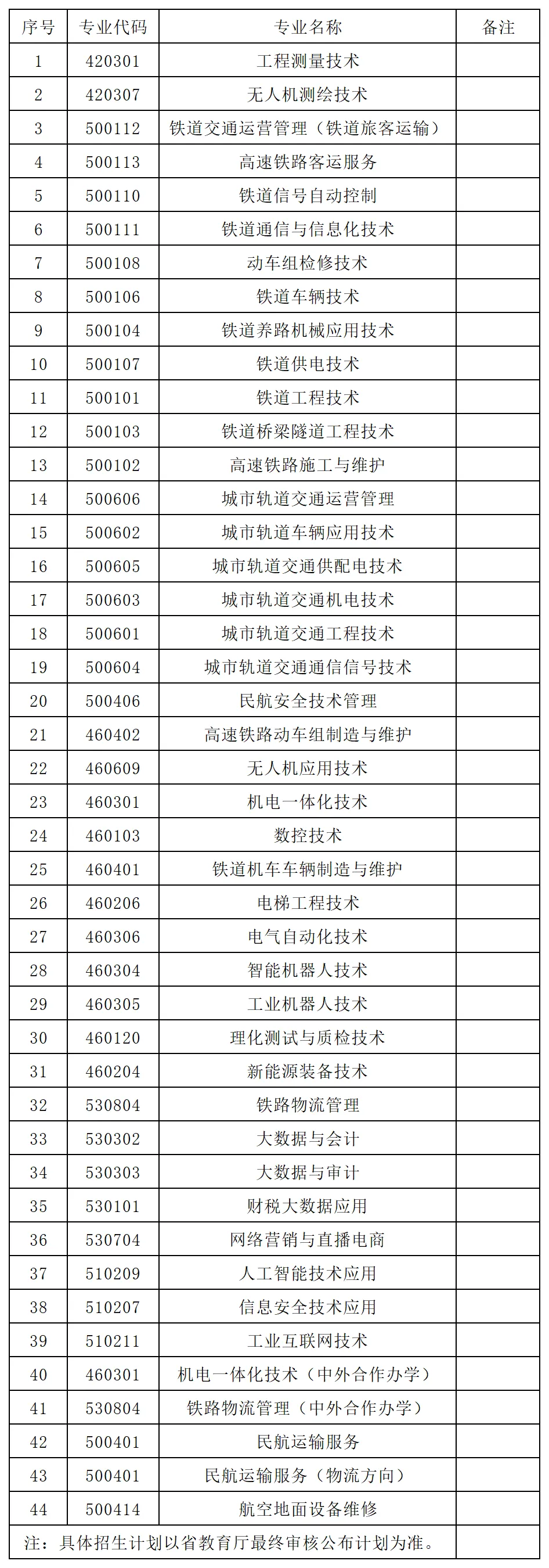 (2)铁道信号自动控制、铁道通信与信息化技术、动车组检修技术、铁道车辆技术、铁道养路机械应用技术、铁道供电技术、铁道工程技术、铁道桥梁隧道工程技术、高速铁路施工与维护、城市轨道车辆应用技术、城市轨道交通供配电技术、城市轨道交通机电技术、城市轨道交通工程技术、城市轨道交通通信信号技术专业要求:本专业对应岗位较适合男生,女生慎报;不招色盲色弱考生。