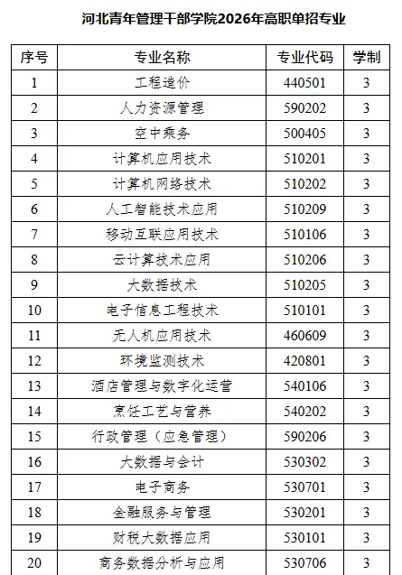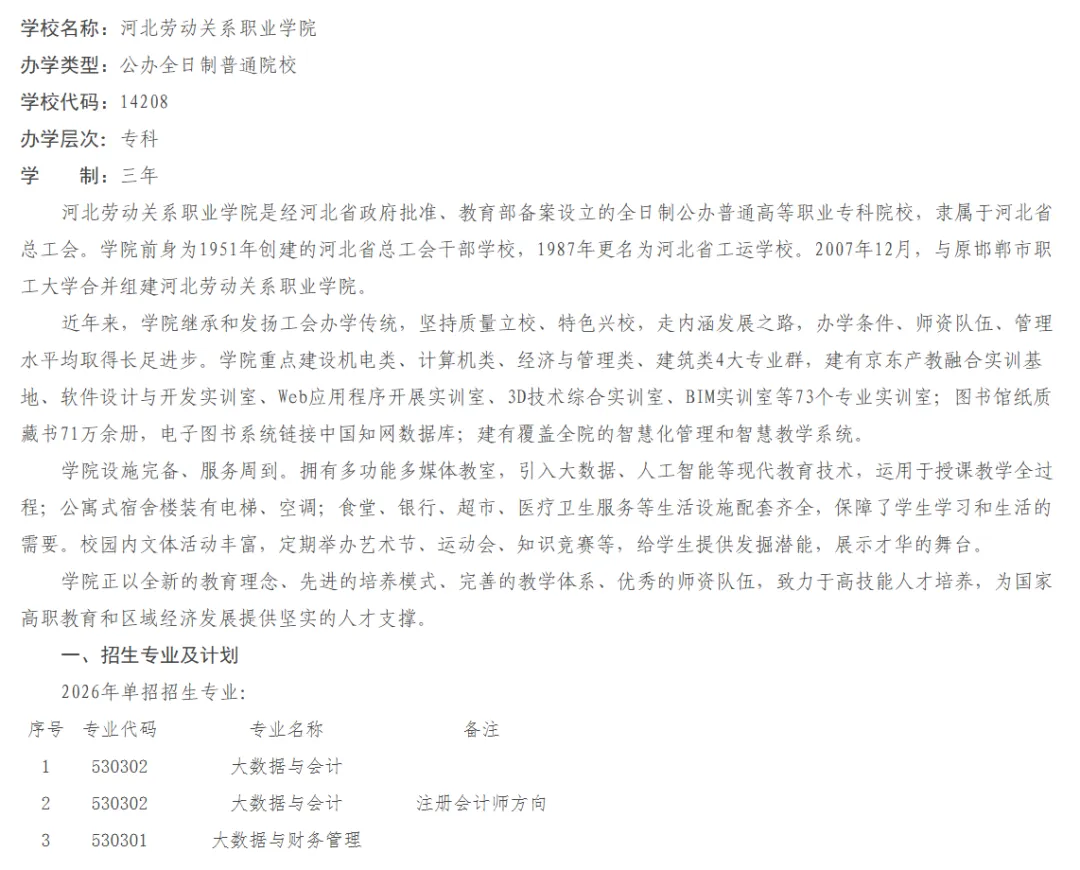1.学院2026年河北高职单招安排530302大数据与会计、460609无人机应用技术、460304智能机器人技术、510102物联网应用技术和510302现代移动通信技术等专业招生,学制均为3年,具体分专业招生计划以河北省教育考试院公布为准。