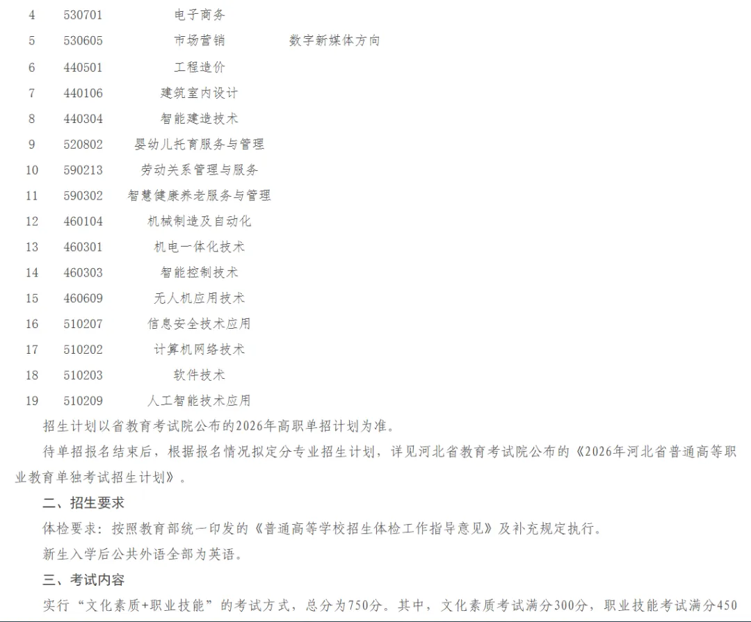 我校高职单招招生专业和招生计划详见河北省教育考试院公布的《2026年河北省普通高职院校单独考试招生计划》。