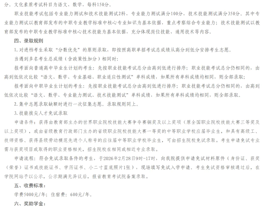 4.对于获得由教育部主办的世界职业院校技能大赛争夺赛铜奖及以上奖项(原全国职业院校技能大赛三等奖及以上奖项),或由省级教育行政部门主办的省级职业院校技能大赛一等奖的中等职业学校应届毕业生,和具有高级工、技师资格、获得县级劳动模范先进个人称号的应往届中等职业学校毕业生,申请免试专业与获奖项目或取得的职业资格相关,符合条件者可在相同或相近专业免试录取。(申请办法详见学校网站)
