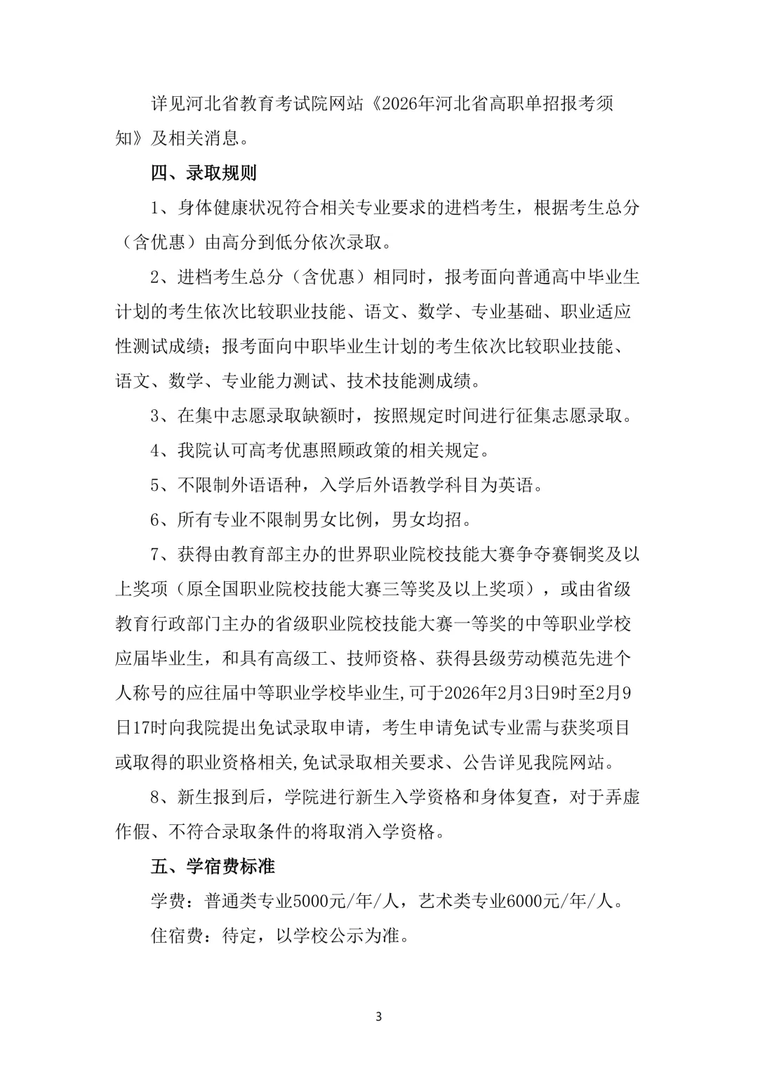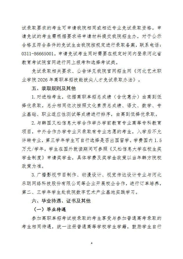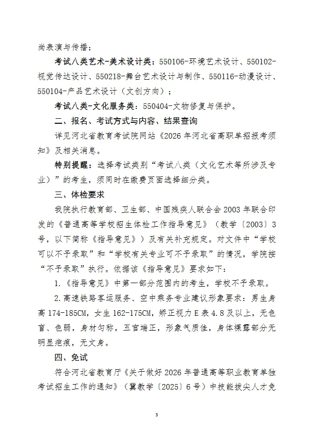3、技能拔尖人才录取。符合河北省免试生录取条件的考生,在2026年高职单招报名结束之日后5日内,将相关证明材料原件及复印件邮寄至我院石家庄市校区,由学院学生工作处审核完毕并与考生取得确认后,统一对社会公示,公示无异议后报河北省教育考试院进行录取备案。
