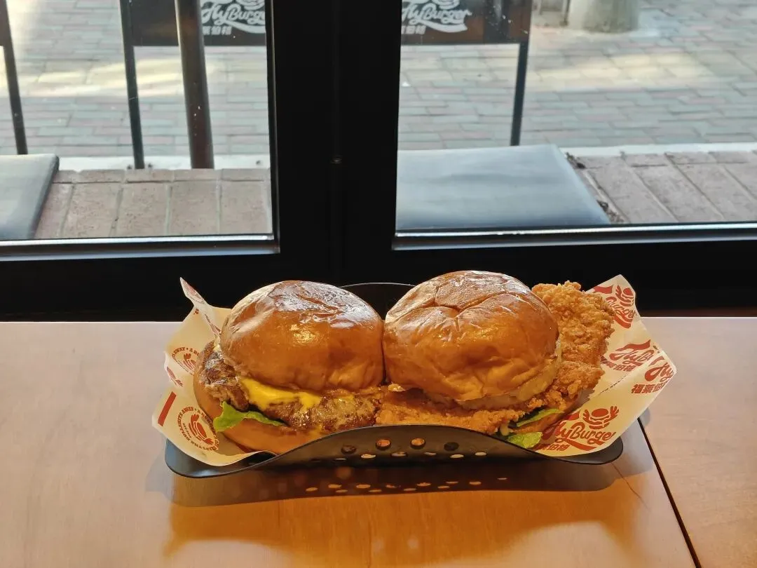 我团购了一个牛肉芝士汉堡和一个凤梨鸡排汉堡