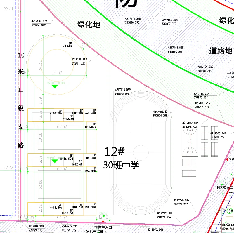 30班中学位于12#地块,实用地面积27006.03,教工人数112人,学生人数1500人。