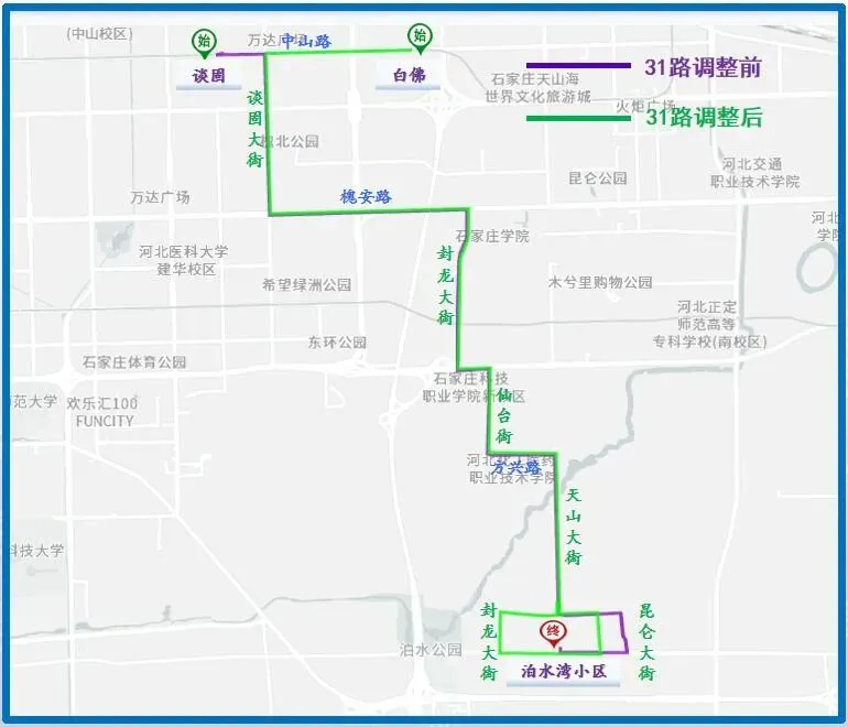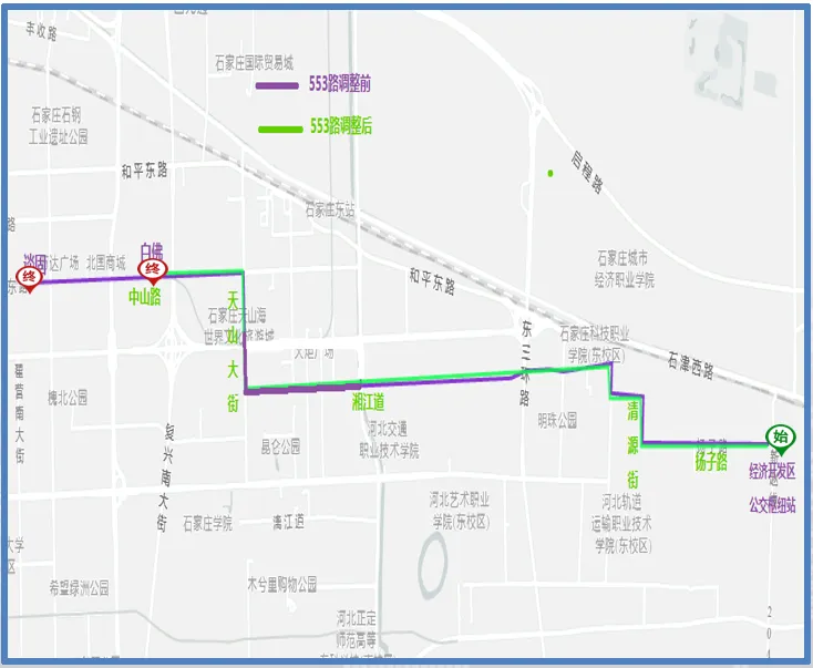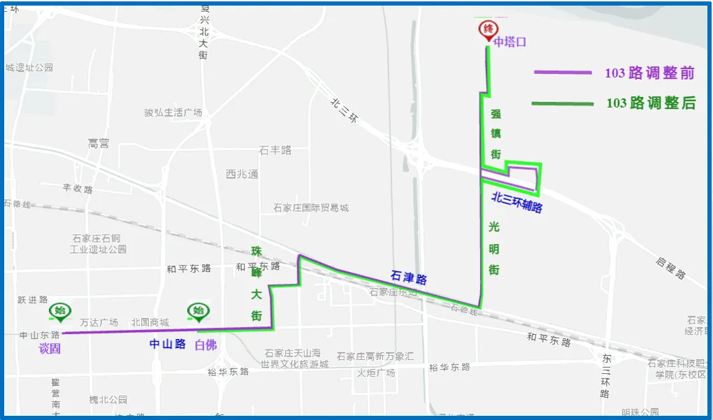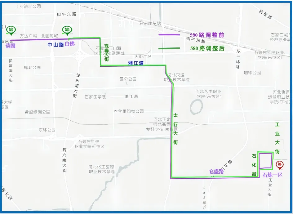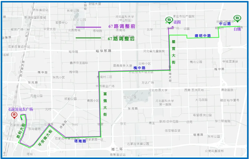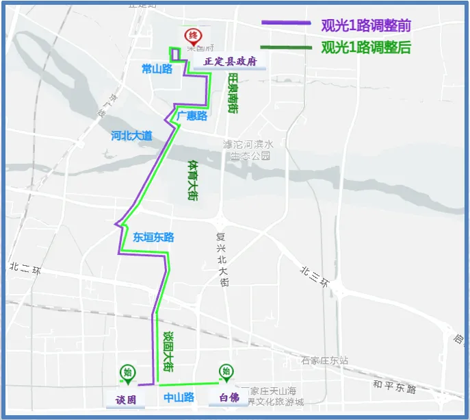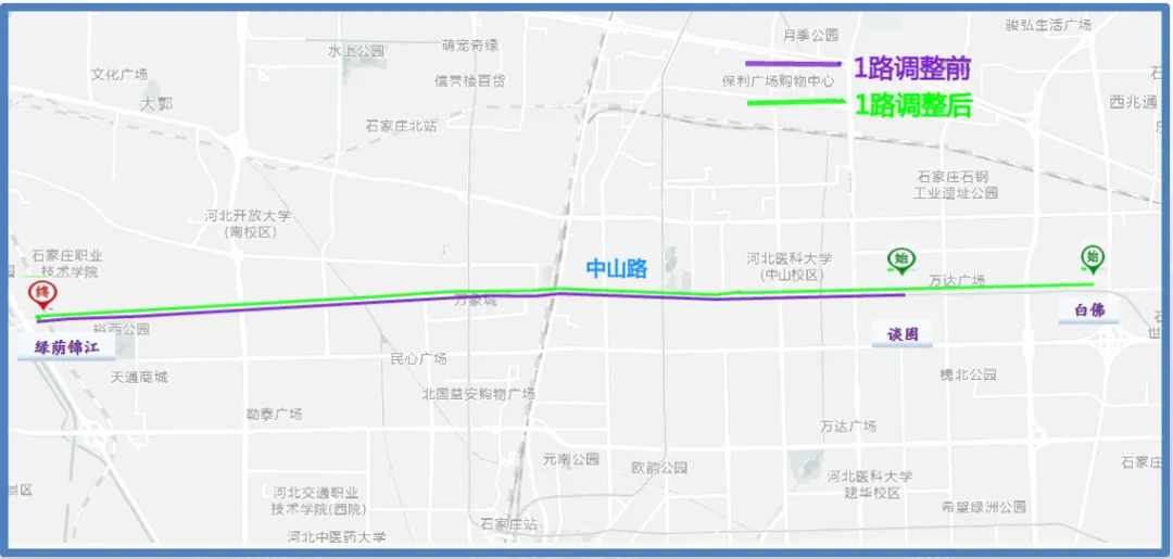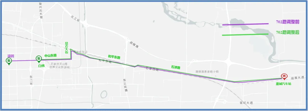 1.起止点:始发站由谈固调整为白佛,终点站石家庄站东广场不变。