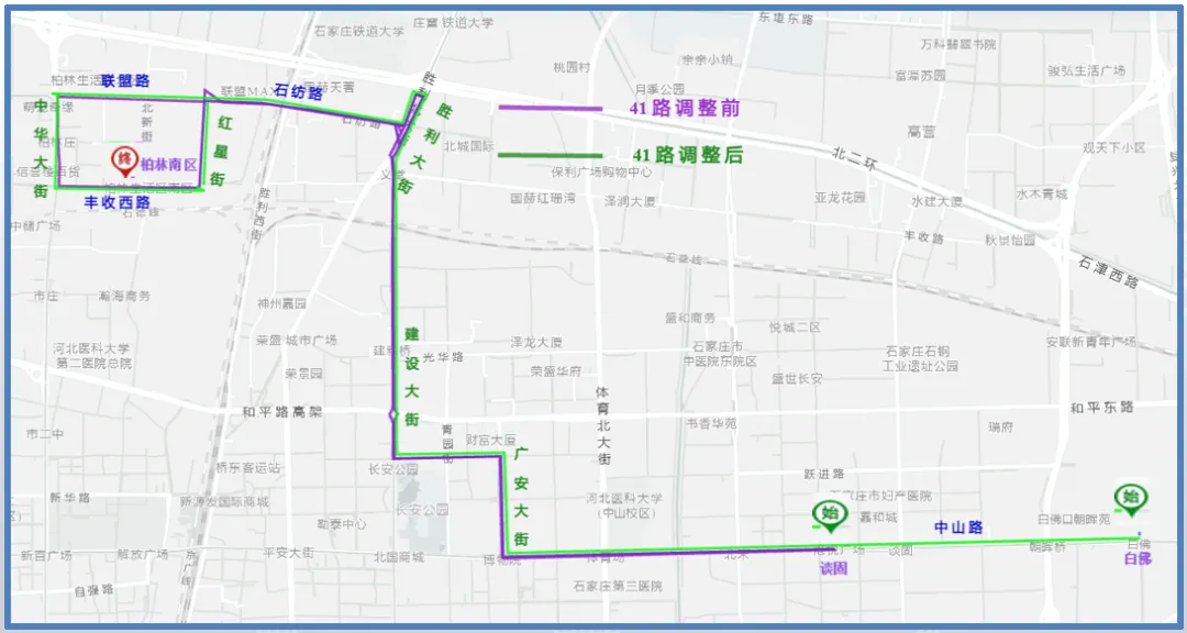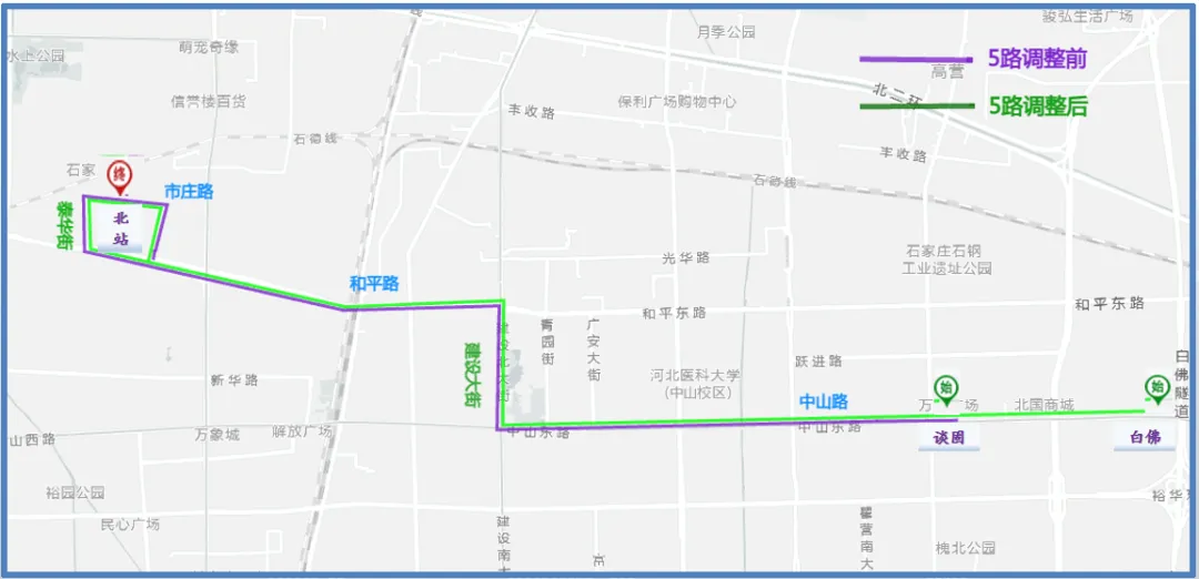 3.调后路径:中山路、谈固大街、高营大街、东垣东路、建华大街、体育大街、河北大道、恒州南街、广惠路、旺泉南街、中山路、镇州街、常山路、府西街、恒山西路、燕赵大街、常山路返回。
