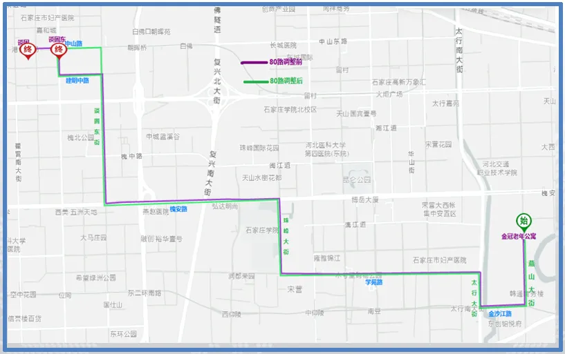 1.起止点:始发站金冠老年公寓不变,终点站由谈固调整为谈固东。