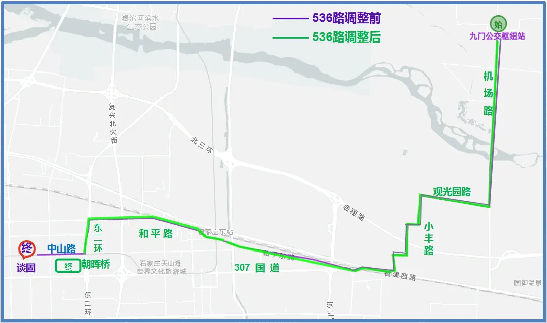 1.起止点:始发站九门公交枢纽站不变,终点站由谈固调整为朝晖桥。