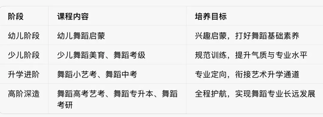 我们深知,舞蹈不是一朝一夕的事,孩子的成长更不是碎片化的拼凑。因此,我们致力于为孩子打造从启蒙到升学、全程不间断的一站式舞蹈成长体系,让每一步都有方向,每一程都有陪伴。