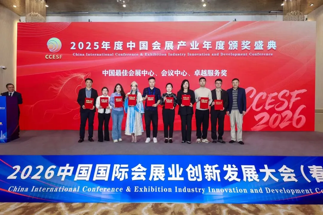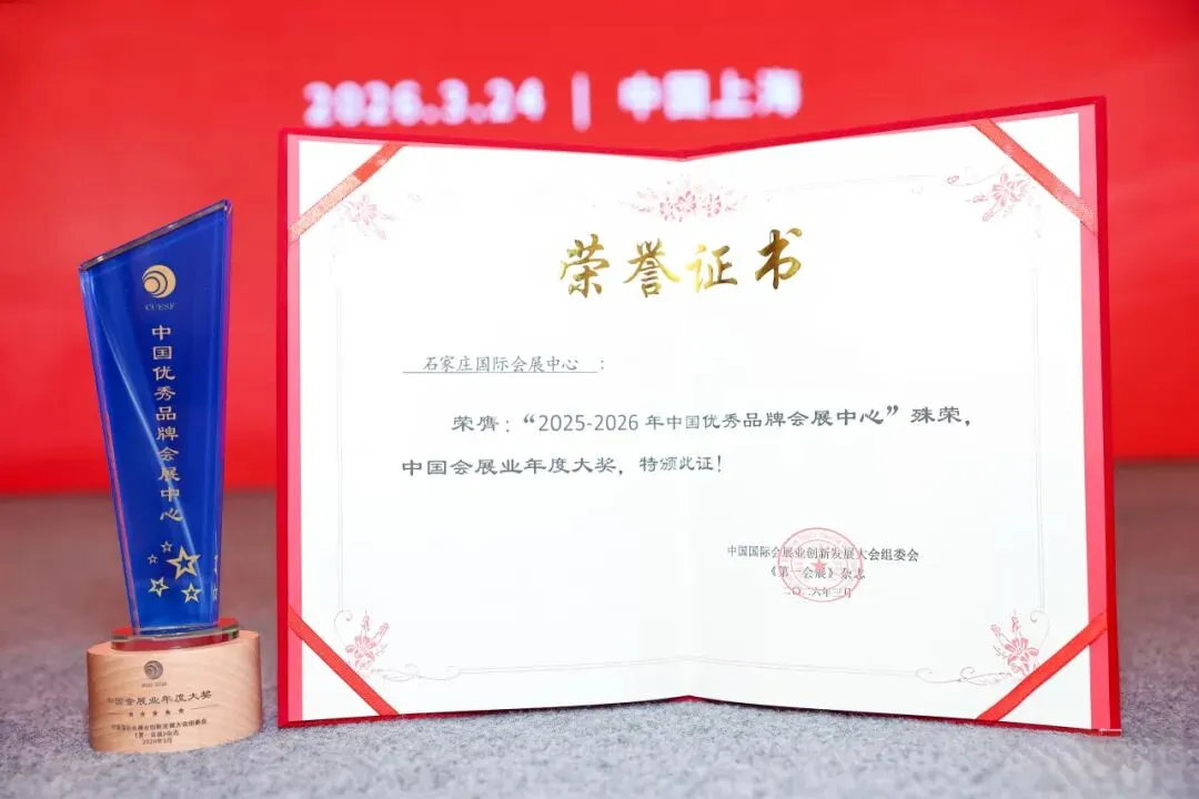 这一荣誉不仅标志着石家庄国际会展中心的品牌价值获得会展行业高度认可,更是其多年来深耕会展领域、以品质铸就标杆的最佳见证,也让中建科工运营品牌在全国舞台上绽放耀眼光芒。▲“2025-2026年中国最佳品牌会展中心”荣誉证书和奖杯