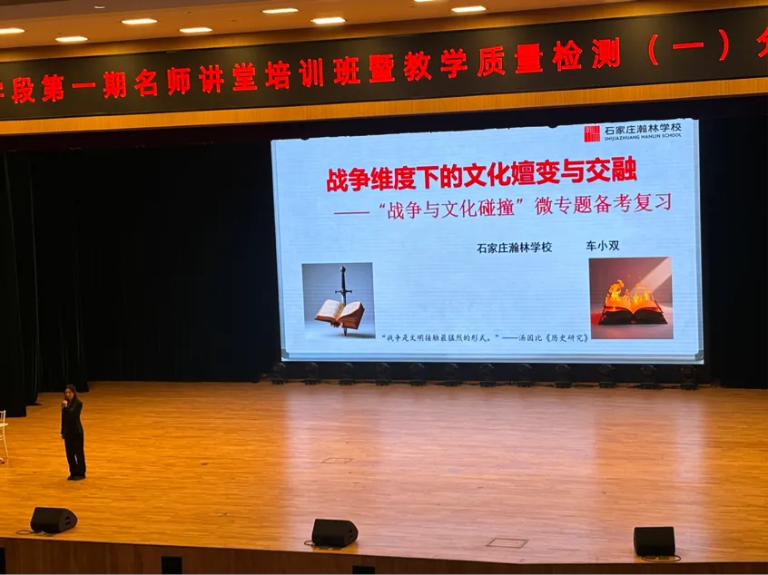 会议第一项内容是石家庄瀚林学校高三历史教师车小双做了主题为《战争维度下的文化嬗变与交融》的专题讲座,她整合中外历史相关内容,从古代亚历山大东征的文化交融、近代拿破仑战争的政治文化重构,到现代亚非拉美民族解放运动的文化新生,构建三维复习框架。结合北京、湖南、海南等多地高考真题,强调试题对时空观念、史料实证等核心素养的考查,提出二轮复习需紧扣课标、强化专题整合的备考思路。